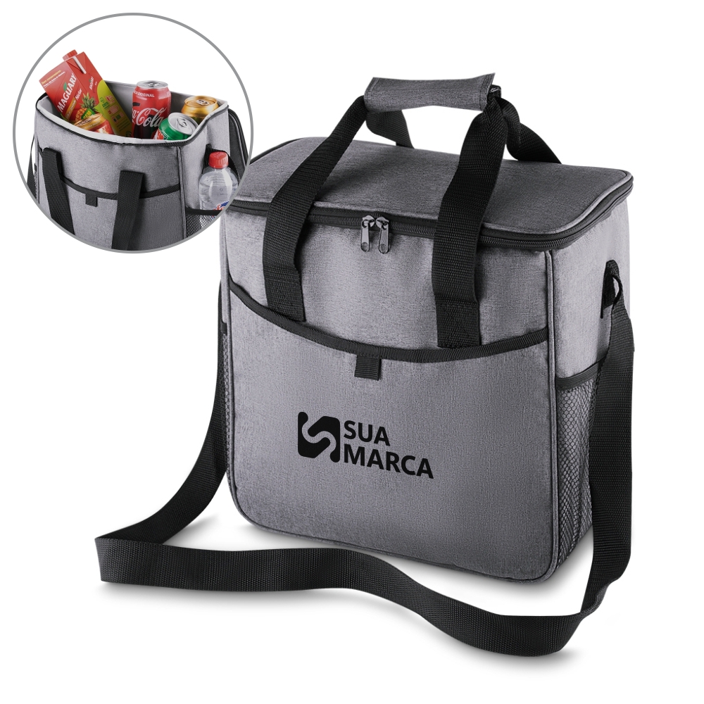 Bolsa térmica, capacidade 16 litros, tecido nylon e poliéster, bolso frontal, alça de ombro regulável, parte interna soldada para retenção de líquidos, gravação da logomarca no bolso frontal ou tampa.