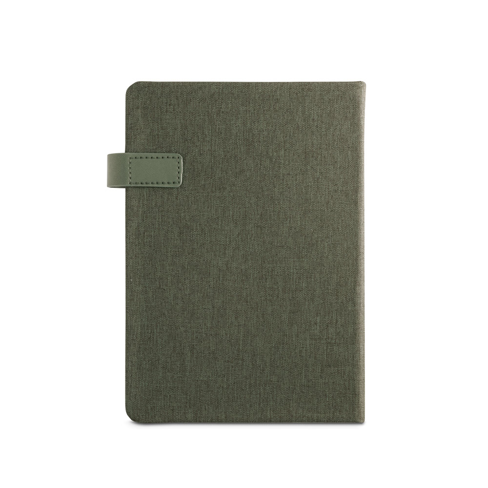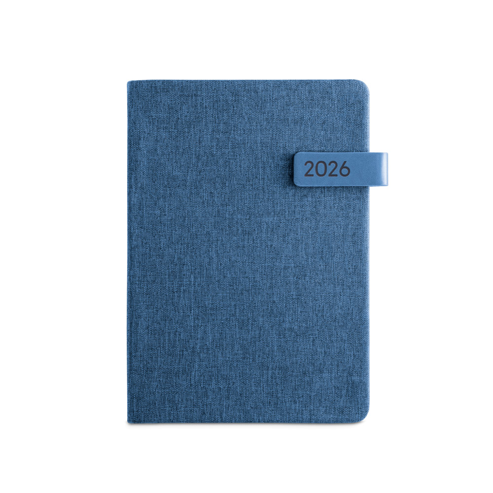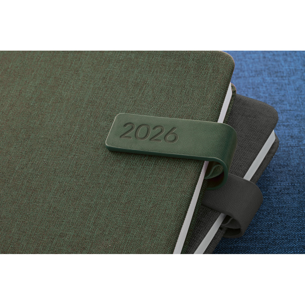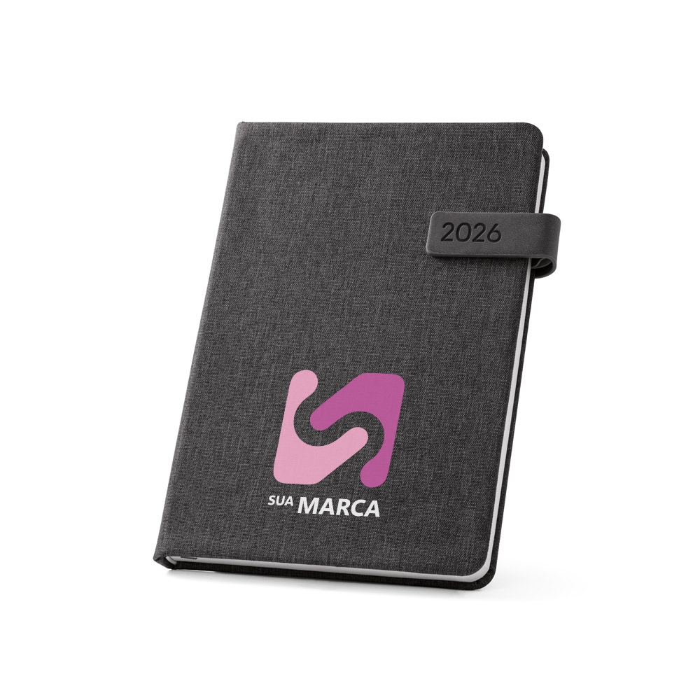 Agenda A5 em PET reciclado (100% rPET), com fecho magnético em PU. Possui um marcador em fita e suporte para esferográfica (não inclusa).