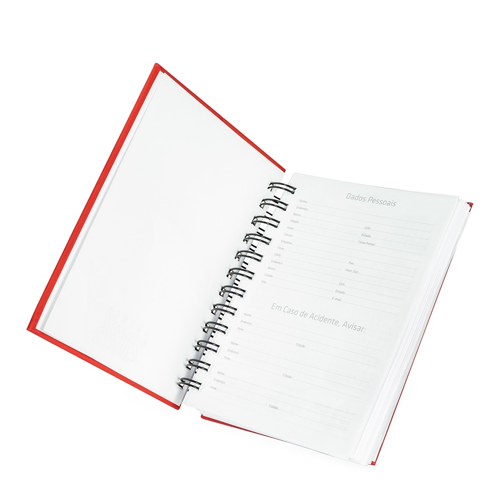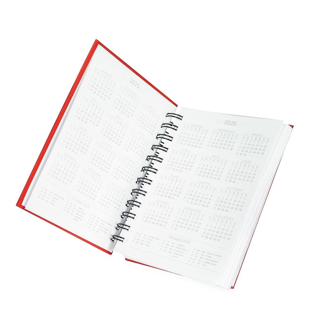 Descrição: Agenda 2026 com capa emborrachada e encadernação em Wire-O metálico. Conta com páginas dedicadas para dados pessoais, calendários de 2025 a 2027, orçamento pessoal, planejamento mensal, espaço para anotações diárias e lista de contatos e aniversários.