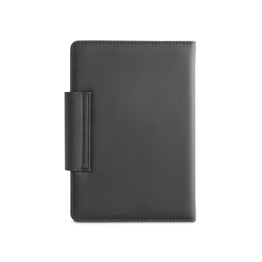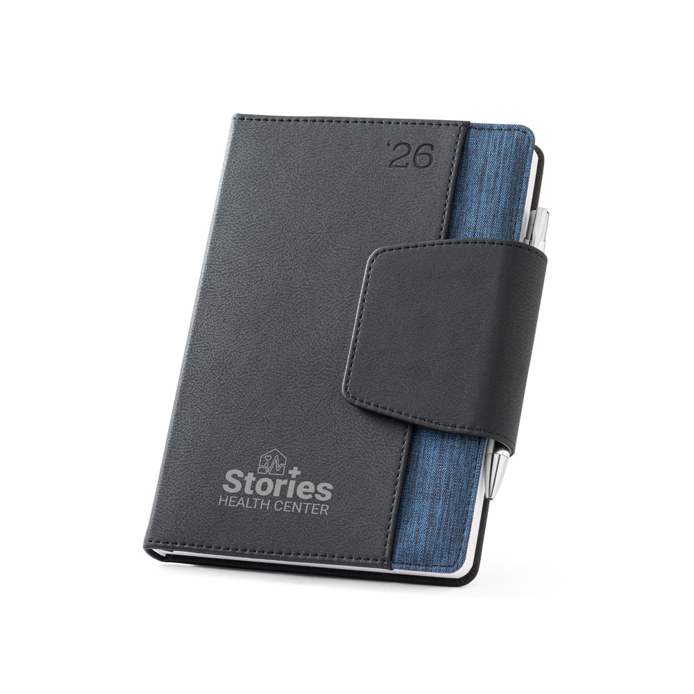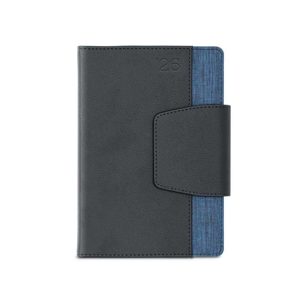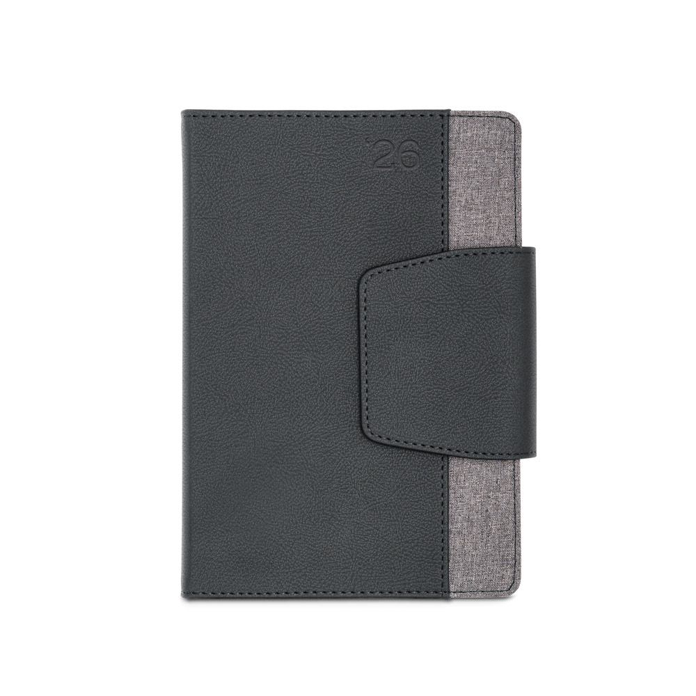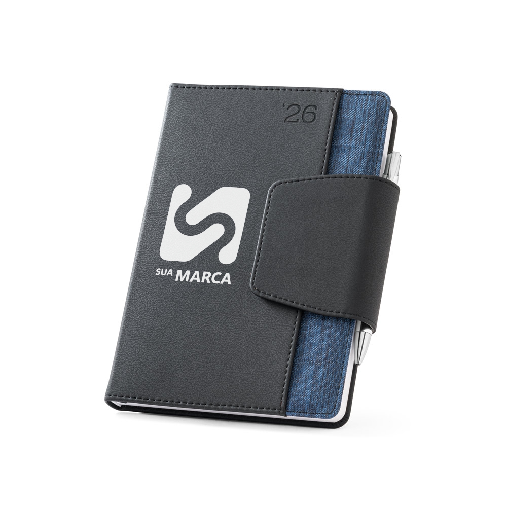 Agenda A5 em PU e tecido em poliéster. Possui fecho magnético, bolso frontal, suporte para esferográfica (inclusa) e marcador em fita.