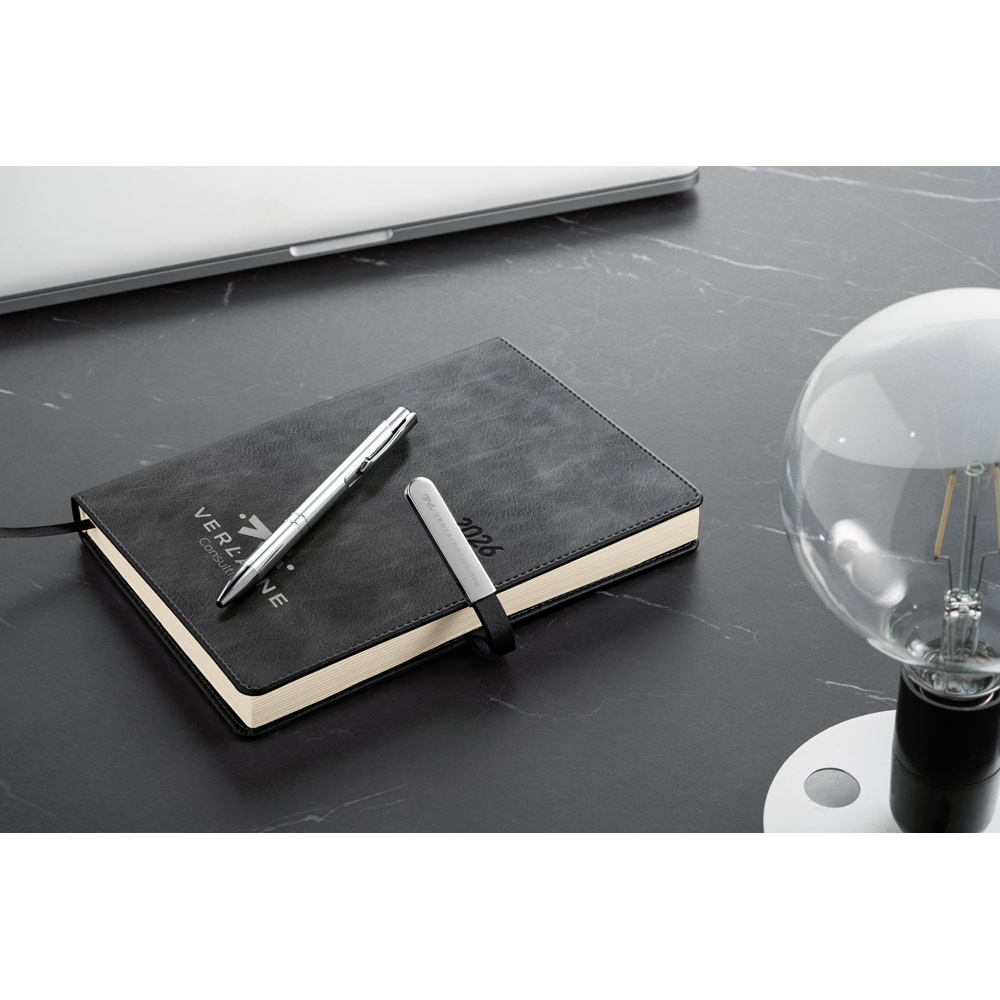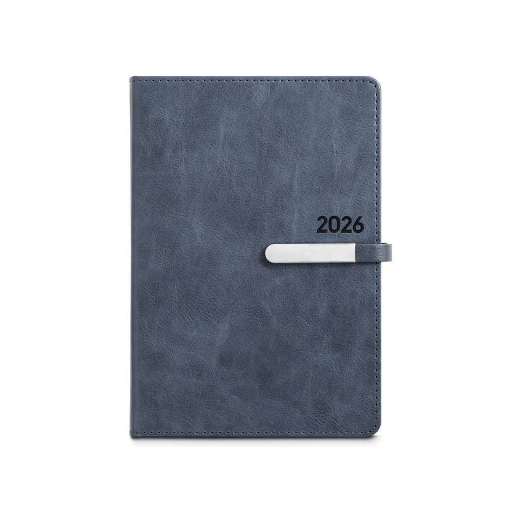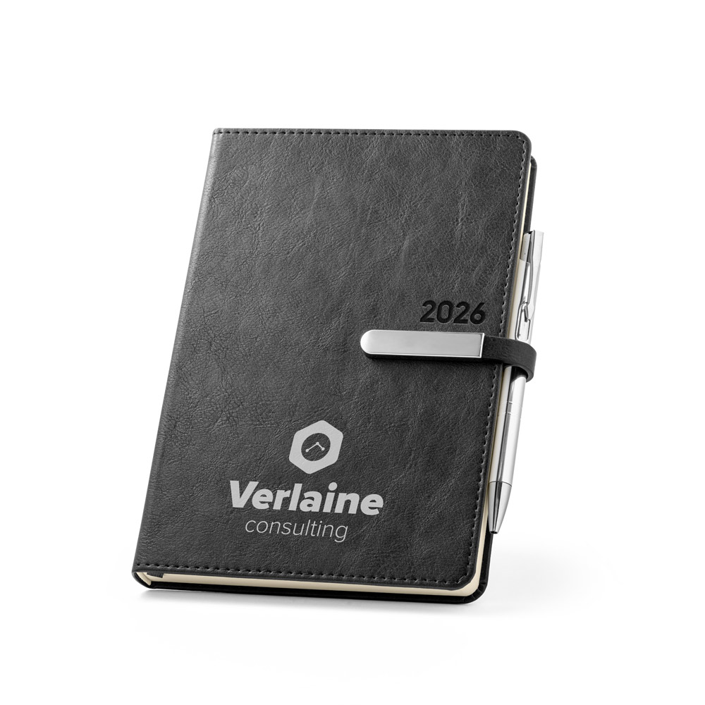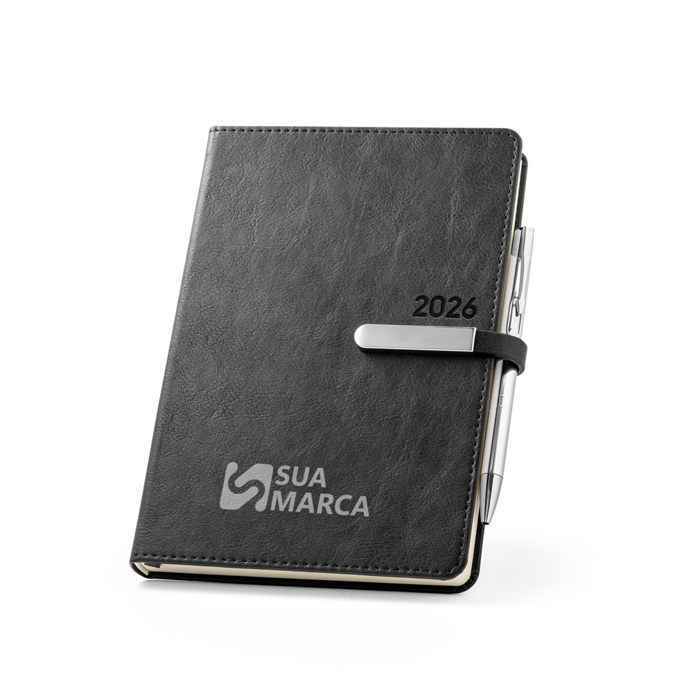 Agenda A5 em PU, com fecho magnético e peça metálica brilhante. Possui um suporte para esferográfica (inclusa) e marcador em fita.