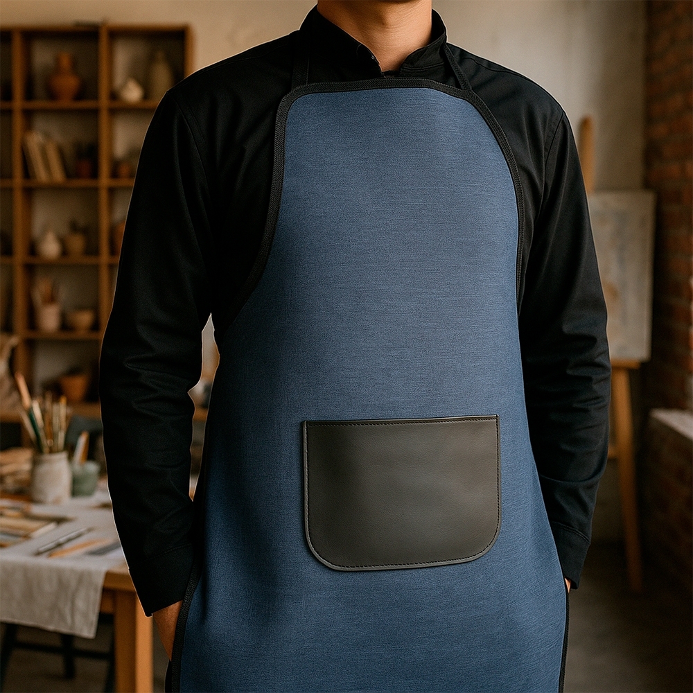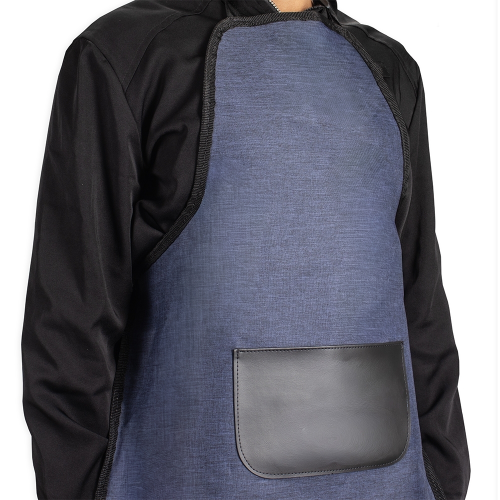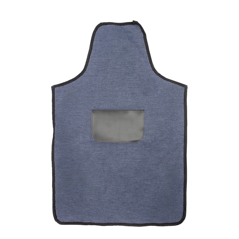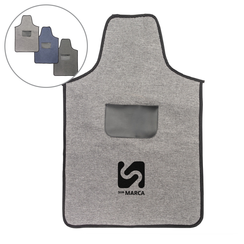 Avental resistente à água confeccionado em poliéster mesclado com PVC. Possui bolso com revestimento interno em bidim e alças para pescoço e cintura ajustáveis.
