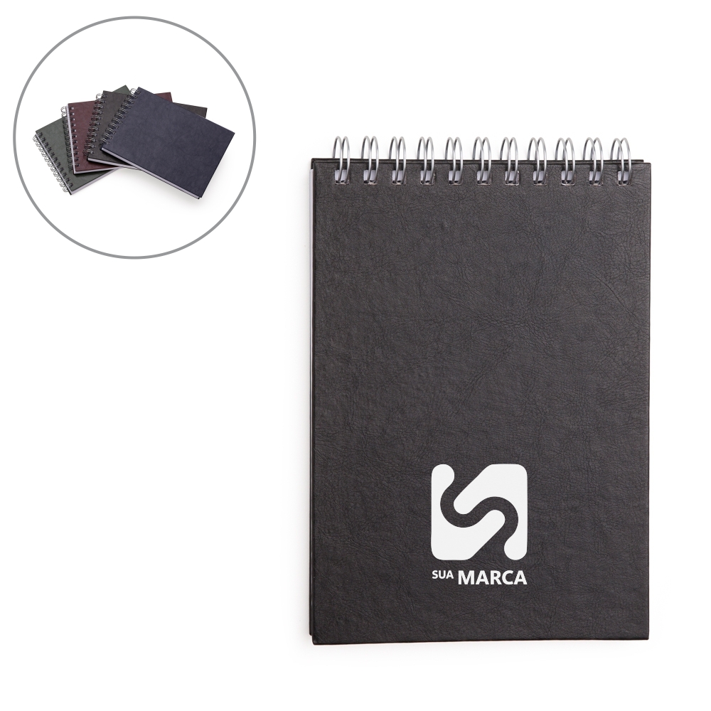 Descrição: Bloco de anotações em couro sintético texturizado e espiral prata metálico. Possui aproximadamente 80 folhas brancas sem pauta, abertura superior.