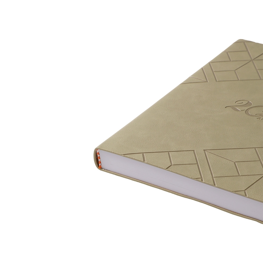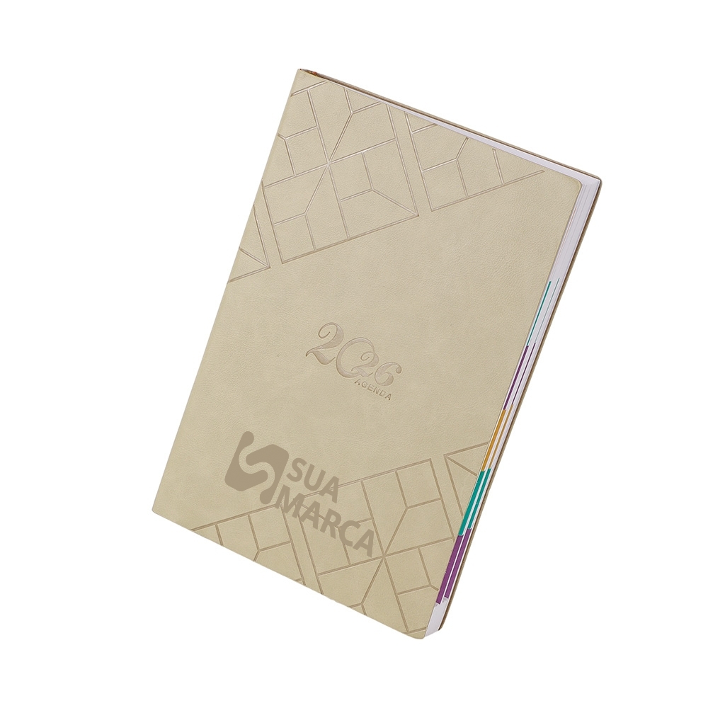 Agenda 2026 de couro sintético com abas mensais e marcador de página em cetim.
