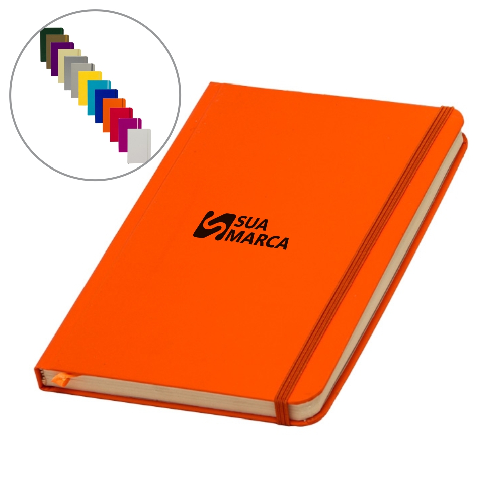 Caderneta de papel couchê, contém aproximadamente 72 folhas amarelas com pauta e 16 folhas sem pauta, marcador de página em cetim, elástico para lacre e compartimento em papel para documentos ou anotações.