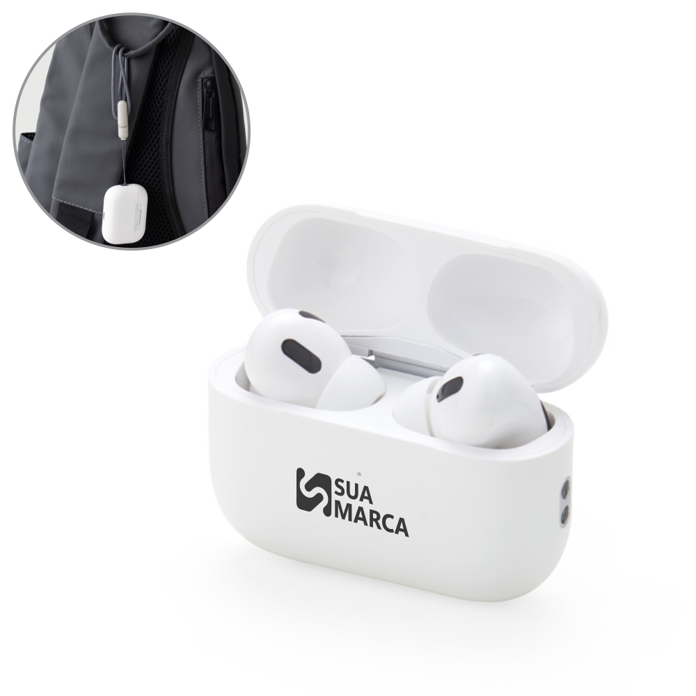 Descrição: Fone de ouvido bluetooth com comandos touch e case carregador de fechamento magnético. Acompanha USB Lightning e cordão de nylon com clipe integrado que facilita a fixação em mochilas e bolsas.