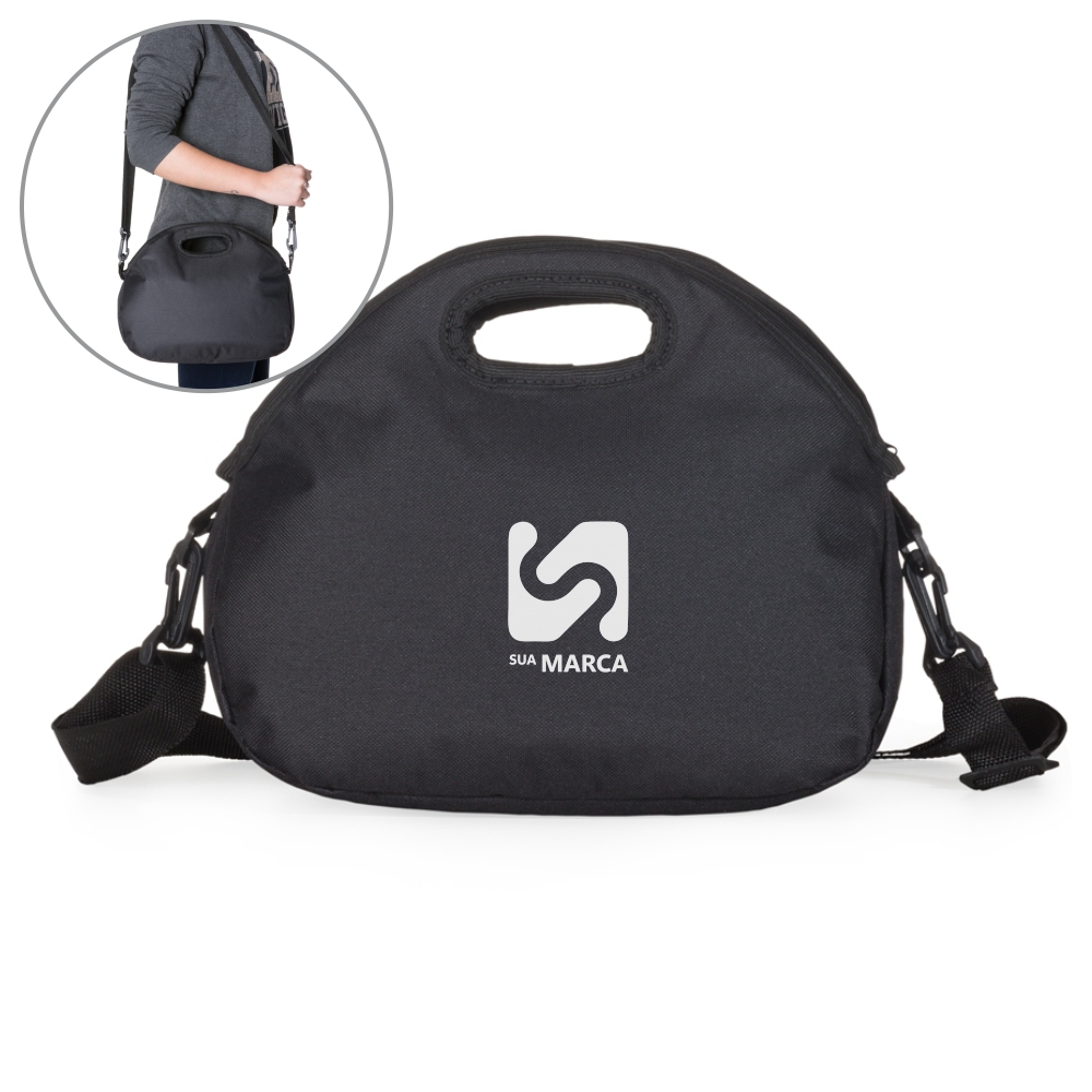 Descrição: Bolsa térmica de mão com 8 litros, material externo de nylon. Acompanha plaquinha para personalização e alça com gancho para utilizar carregada ao corpo.
