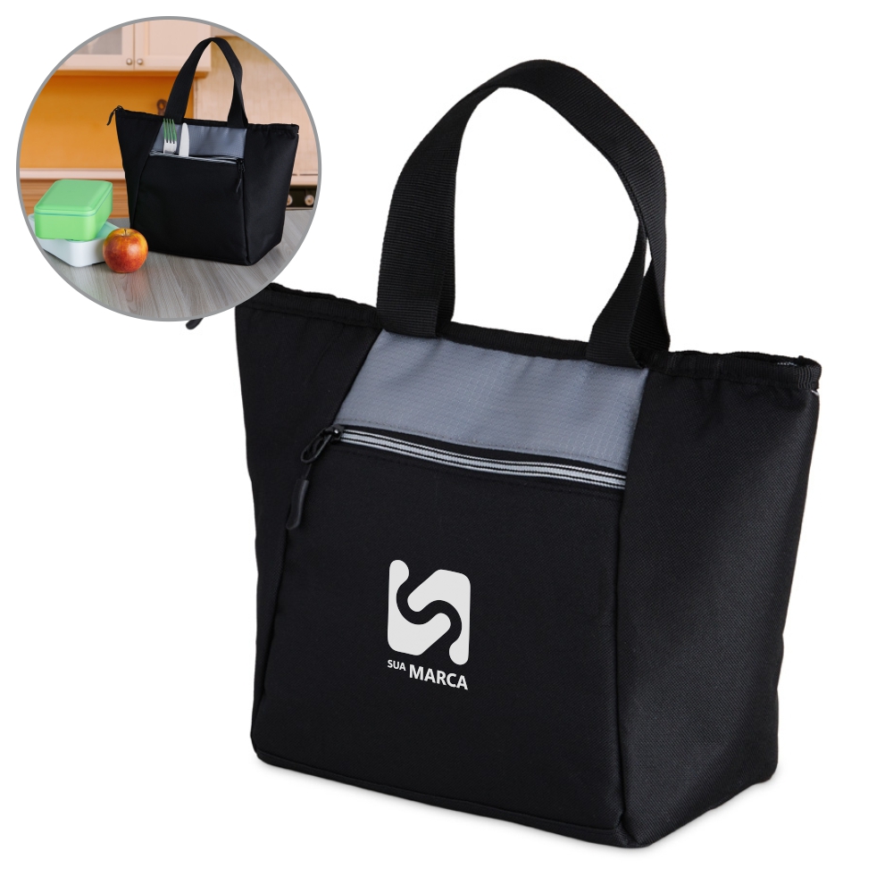 Bolsa térmica com capacidade de 7 litros com bolso frontal e alças de mãos.