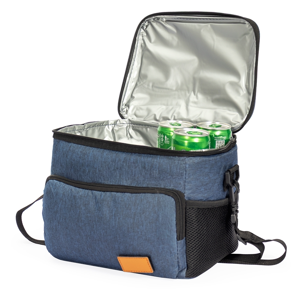 Descrição: Bolsa térmica confeccionada em Oxford resistente à água, fechamento em zíper, alça de nylon na tampa e capacidade de até 8 litros. Possui revestimento térmico em PEVA atóxico, além de compartimento frontal com plaquinha de couro sintético fixada por velcro e dois bolsos laterais em tela de tecido respirável com elástico. Acompanha alça transversal removível e ajustável.