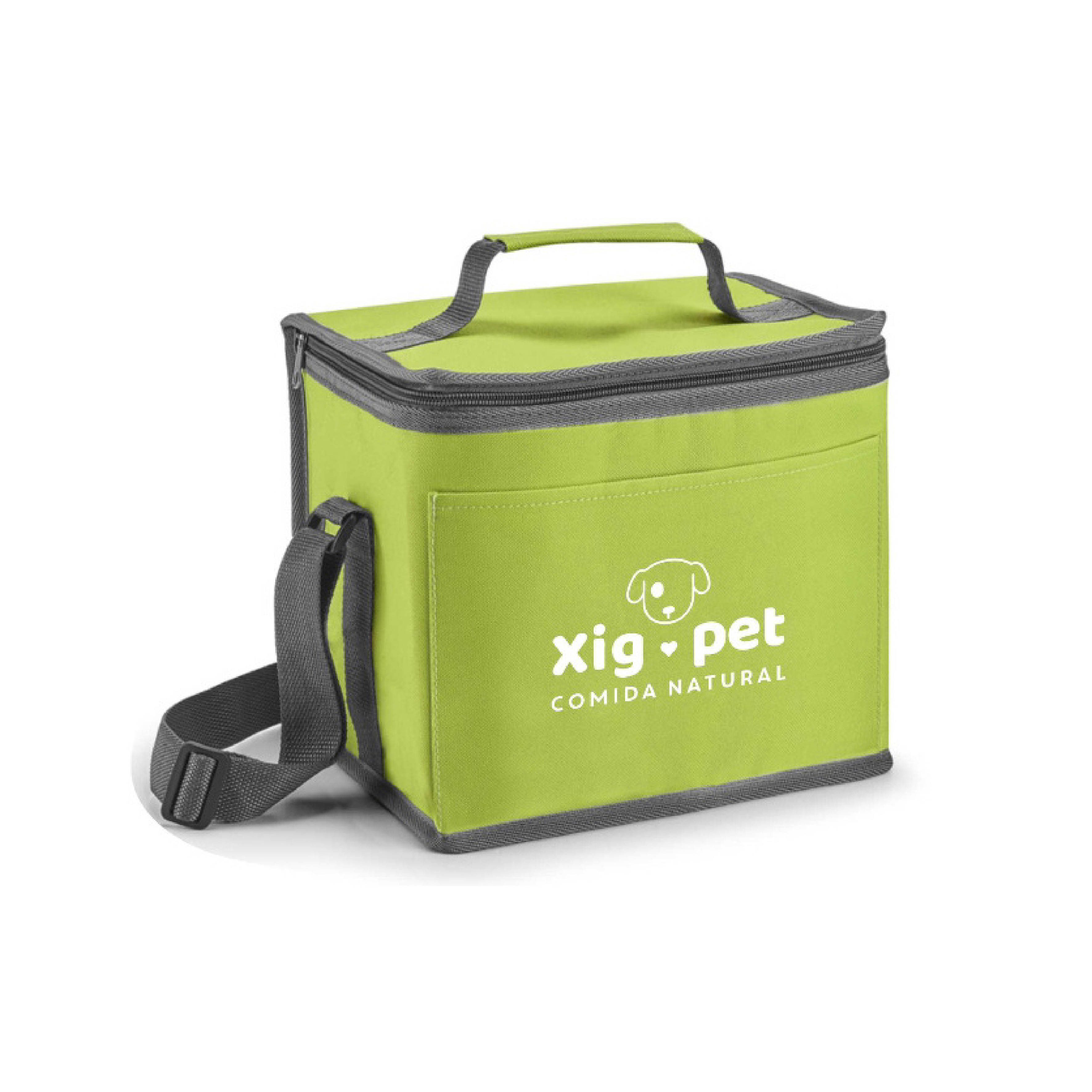 Bolsa térmica. 600D. Com alça ajustável em webbing e bolso frontal. Capacidade até 9 litros. Food grade. 240 x 220 x 170 mm.