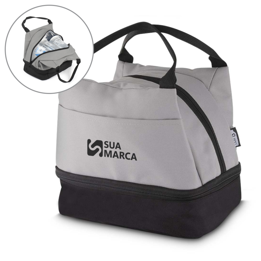 Bolsa térmica em tecido PET Reciclado com 2 compartimentos térmicos, bolso frontal e alça de mão.
