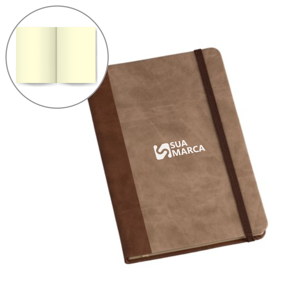 Caderneta Grande tipo MOLESKINE capa com Recorte Marrom Escuro| Marrom Claro com Elástico Marrom SEM PAUTA - 80 Folhas Sem Pauta. Formato: 14x21cm - Miolo em papel PÓLEN NATURAL levemente amarelado - 80 gramas - Capa em couro sintético emborrachado - com elástico. Formato: 13,75x20,5cm