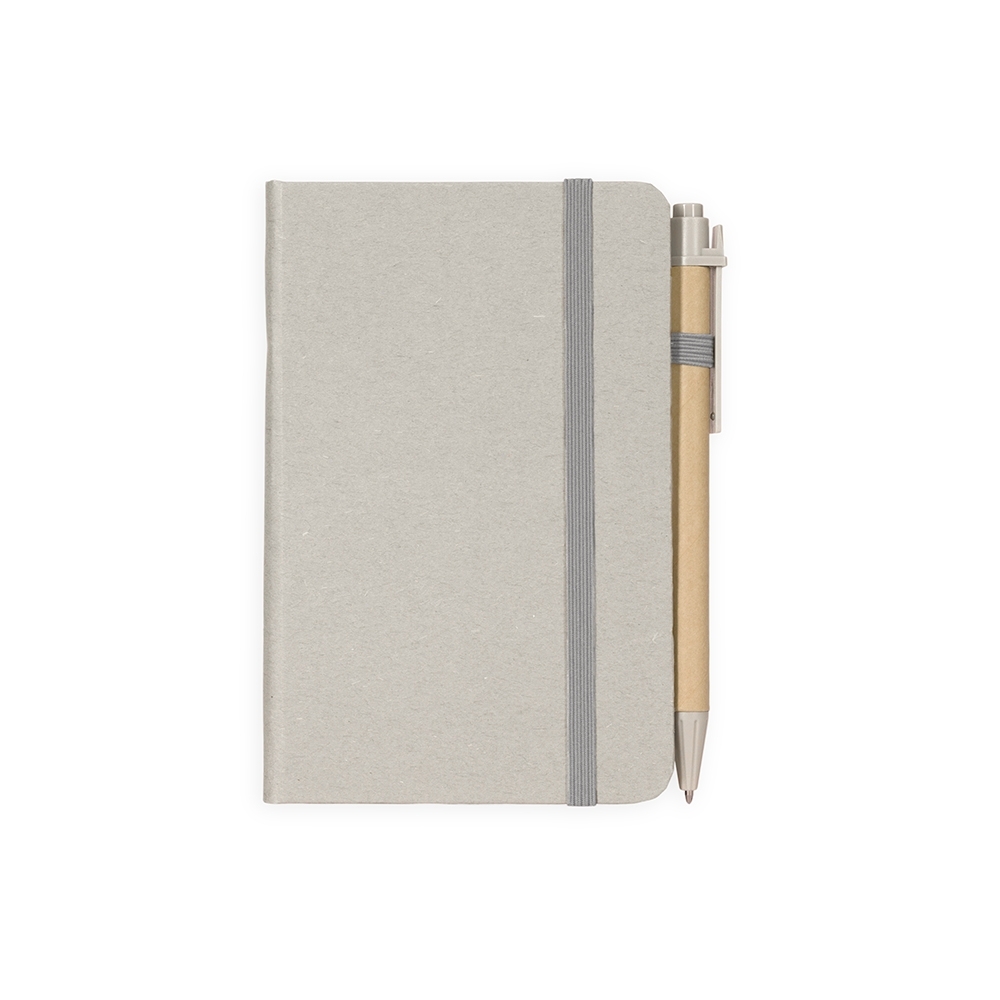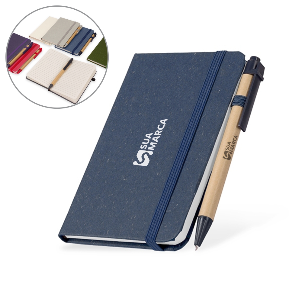 Descrição: Caderneta ecológica de capa dura revestida em fibra de palha de trigo. Contém aproximadamente 80 folhas brancas com pauta, além de duas folhas de guarda, uma fita para fechamento e porta-canetas elástico. Acompanha uma caneta esferográfica de carga azul de 1,0mm com corpo em papelão e clip, acionamento por clique e ponteira em plástico.