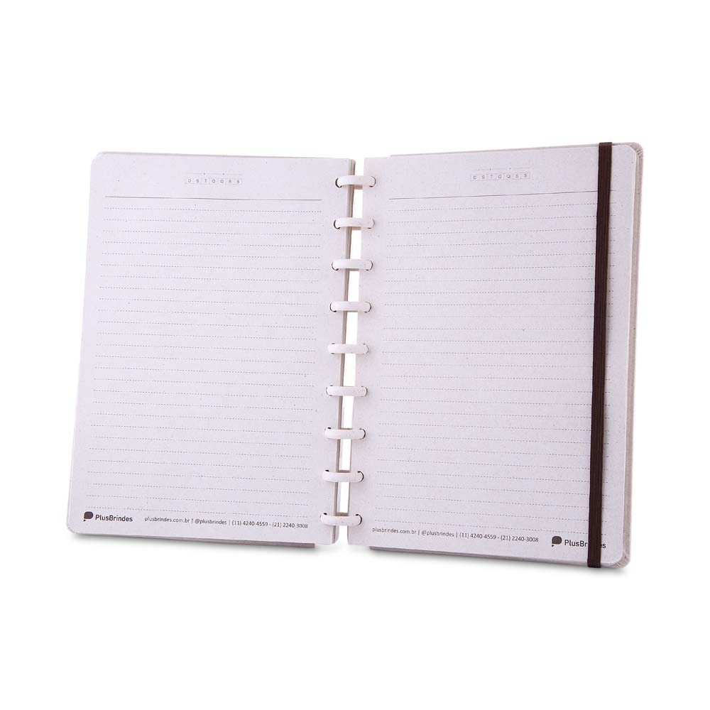 Caderno de anotações com folhas removíveis, capa dura cartonada revestida em material sintético, 80 folhas pautadas 75 g/m², calendário anual, manual de instruções, bolso plástico interno para documentos e elástico para fechamento seguro.