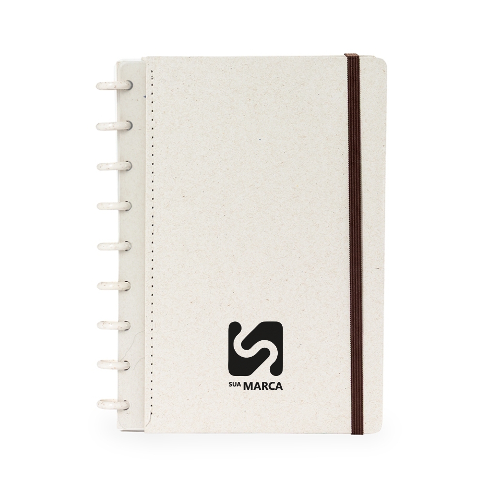 Caderno de capa dura em papel reciclado, com fechamento em elástico e encadernação em discos de fibra de arroz, que permitem adicionar ou retirar folhas compatíveis. Possui páginas dedicadas para dados pessoais, calendários de 2025 e 2026 e um manual para troca e retirada de folhas. Possui cerca de 80 folhas em papel reciclado pautadas.