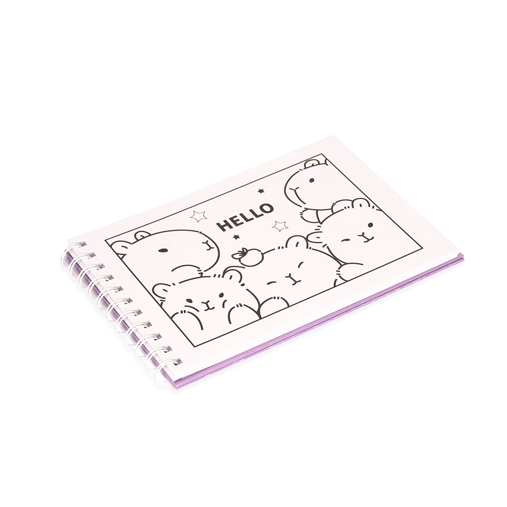 Descrição: Caderno de colorir de capa dura com laminação holográfica e encadernação Wire-O. Possui aproximadamente 48 folhas contendo ilustrações de capivara e outros animais em situações leves e divertidas. Acompanha uma folha protetora destacável em acetato.