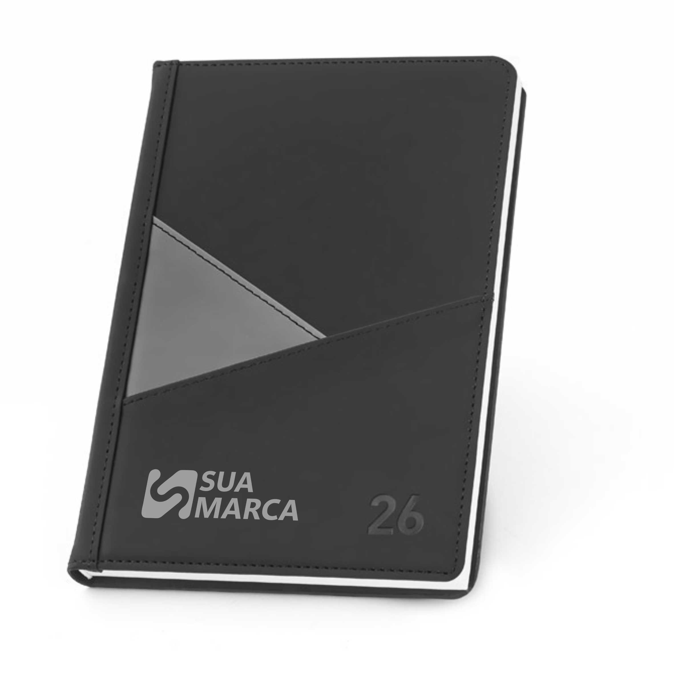 Agenda A5 em PU. Possui 2 bolsos exteriores na capa para guardar pequenos objetos e um marcador em fita.