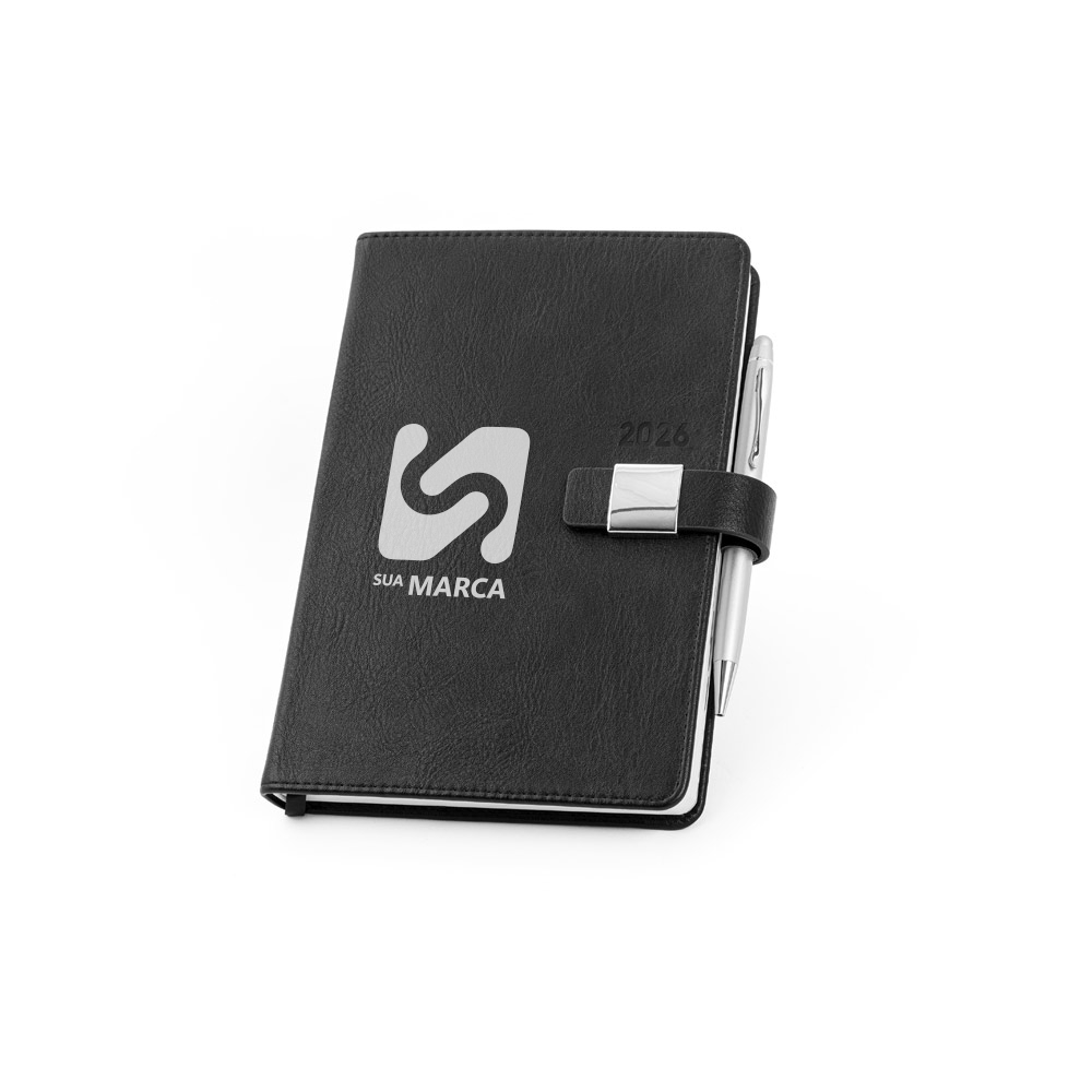 Agenda A5 em PU (58% reciclado), com fecho magnético e placa metálica.
