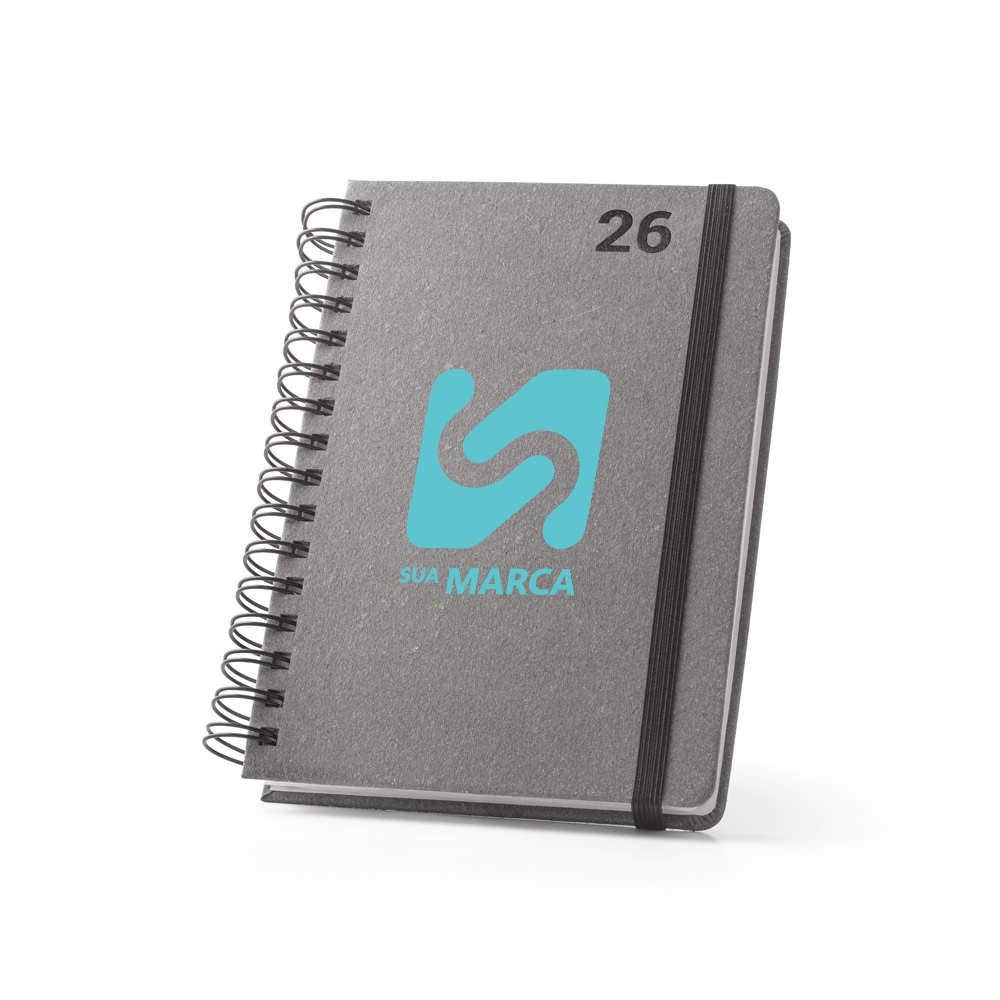 Agenda A5, com argolas, em pele (58% reciclada). Possui um elástico para fecho da agenda.