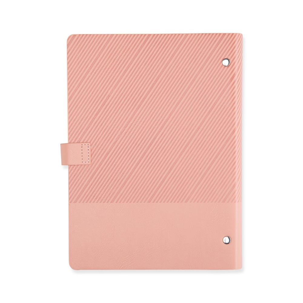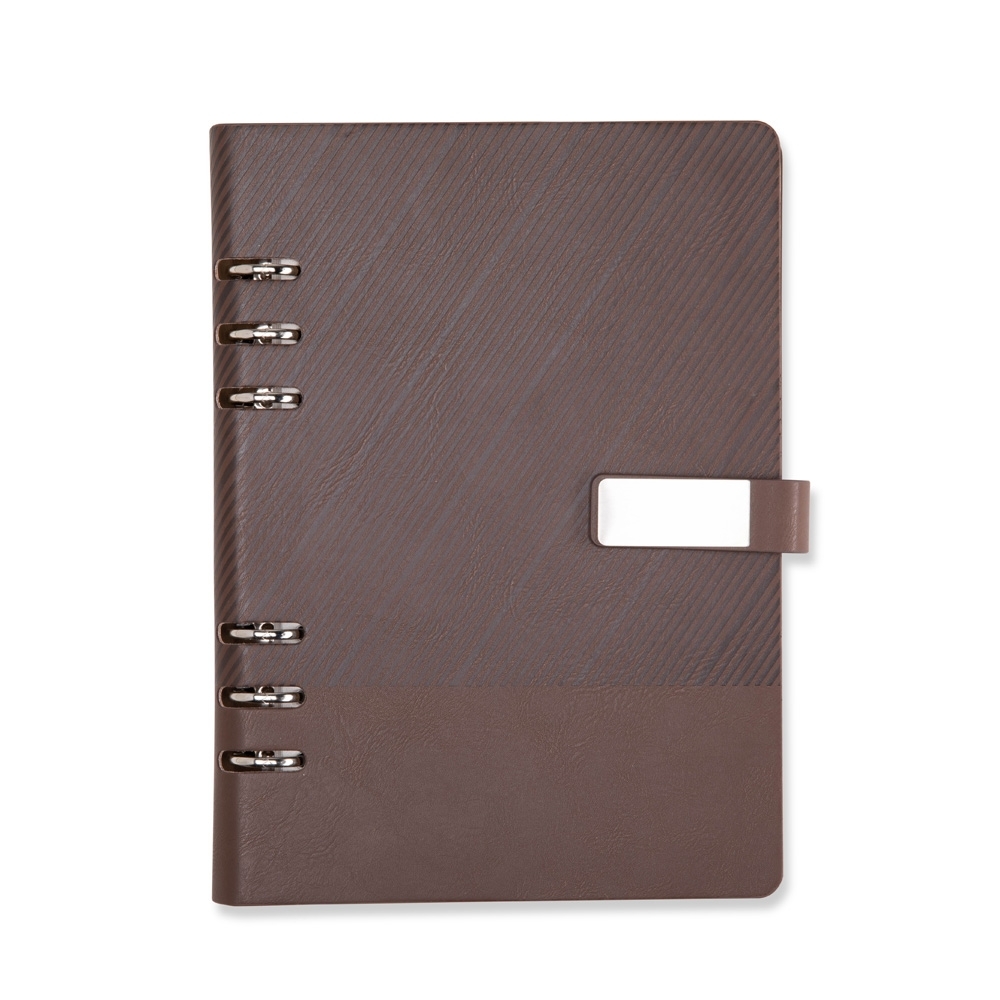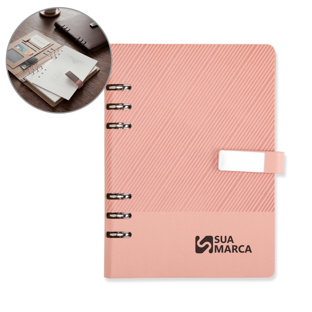 Caderno tipo fichário com capa dura texturizada em couro sintético, fecho magnético e plaquinha metálica fixa à aba. Possui mecanismo de argolas em aço carbono com abertura facilitada e parte interna da capa com compartimento para três cartões, porta-caneta e visor em plástico transparente para documentos.