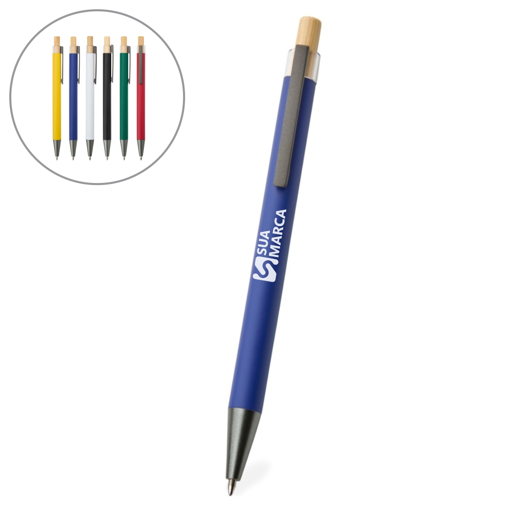 Descrição: Caneta metálica com carga esferográfica azul e acionamento por clique em bambu.