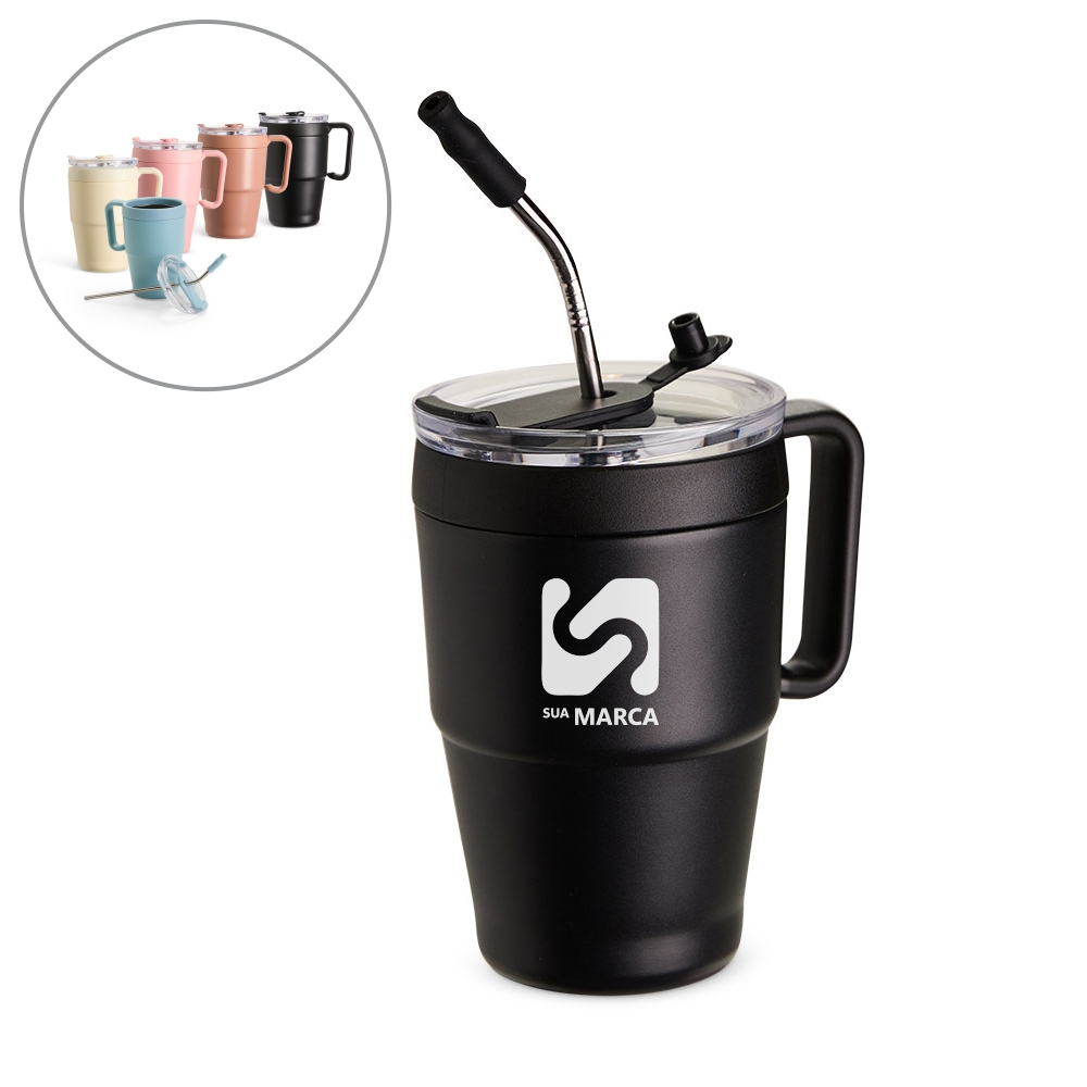 Caneca térmica em inox com pintura eletrostática e capacidade de até 600ml. Apresenta estrutura de parede dupla, base antiderrapante e tampa plástica com vedação a vácuo, protetor emborrachado para o bocal com acesso para canudo.