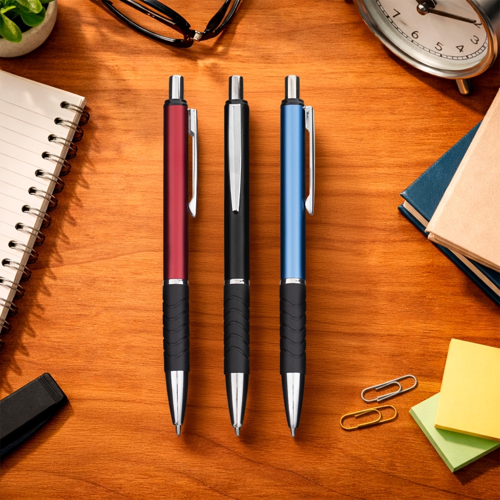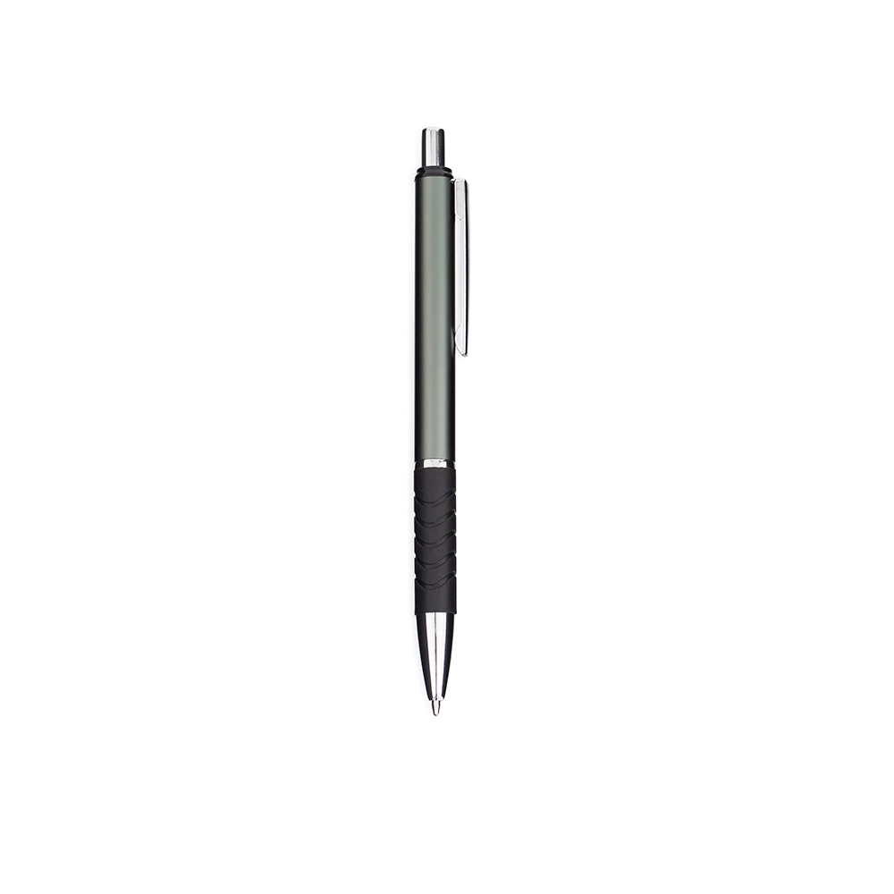 Caneta metálica com detalhe emborrachado próximo à ponta. Conta com acionamento por clique e carga esferográfica azul de 1.0mm.