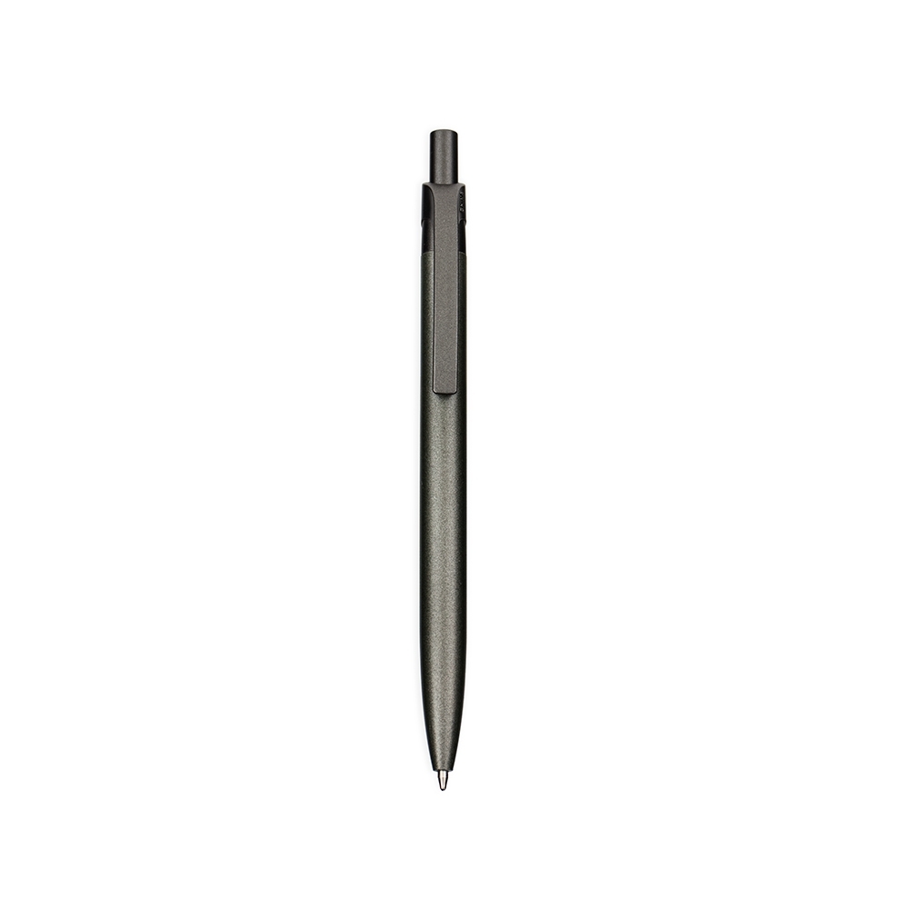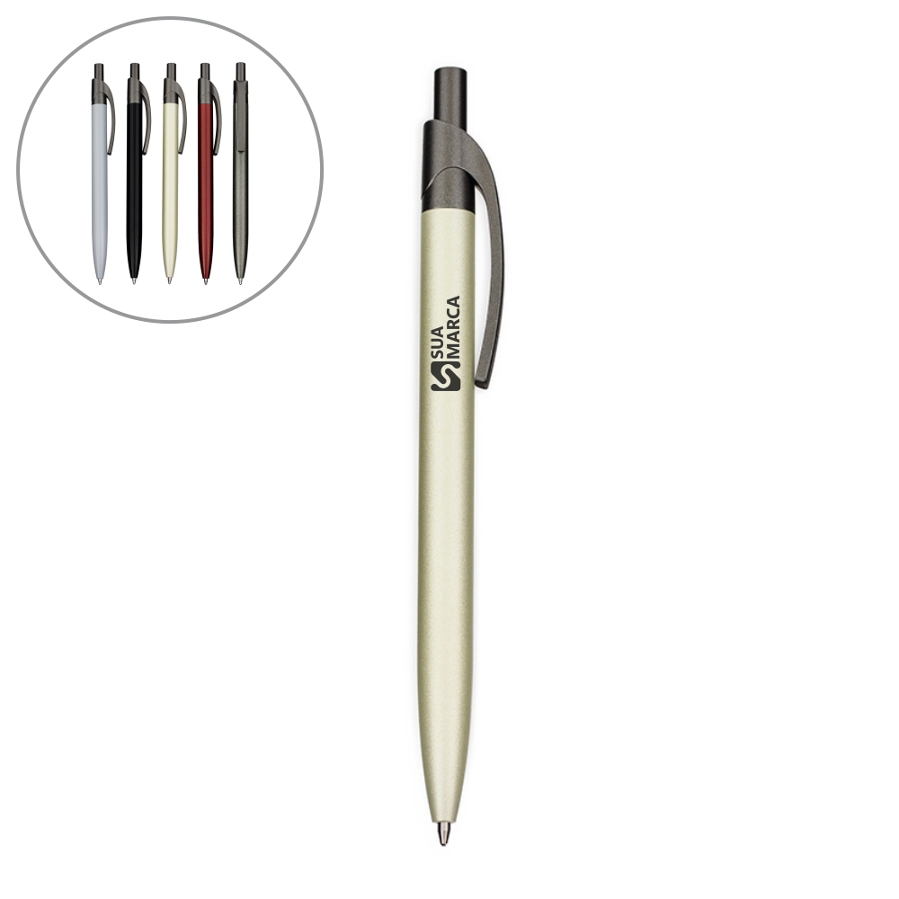 Caneta metálica com acionamento por clique e clip em plástico. Possui carga esferográfica azul de 1,0mm.