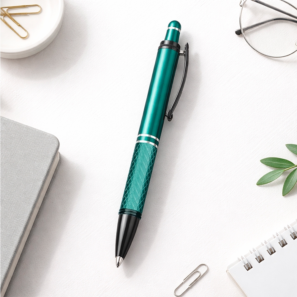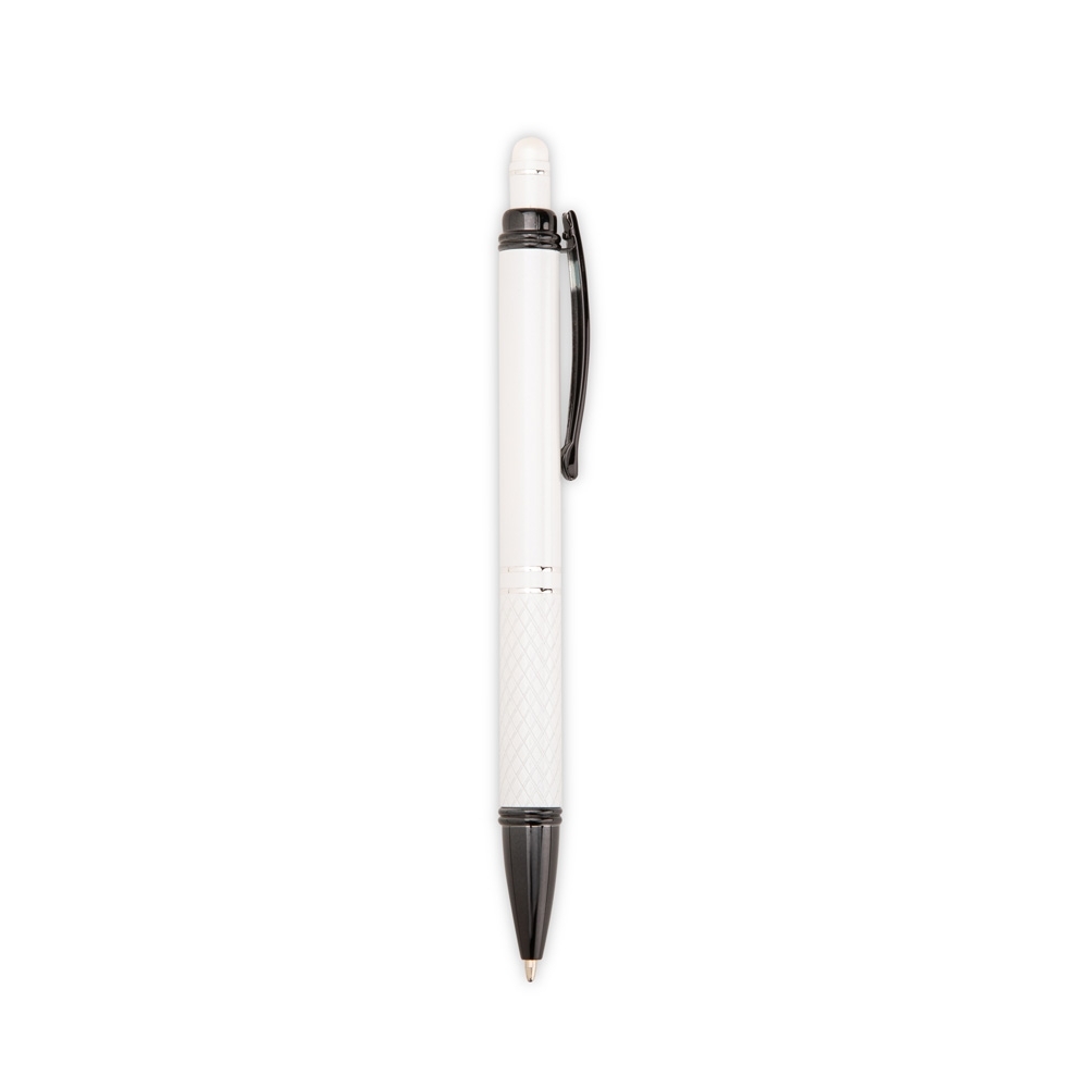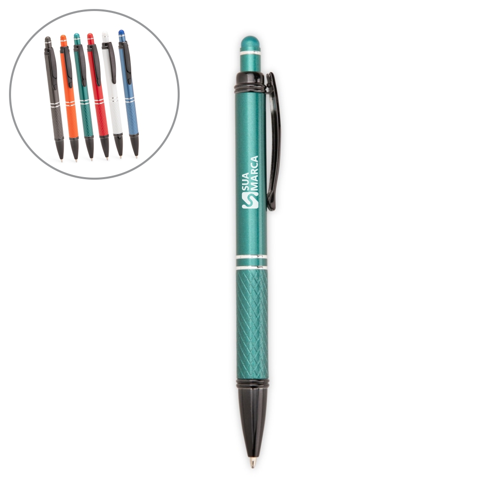Caneta metálica com textura próximo à ponta, detalhes em plástico e acabamento emborrachado no topo para o uso em dispositivos com telas sensíveis ao toque. Conta ainda com acionamento por clique e carga esferográfica azul de 1,0mm.