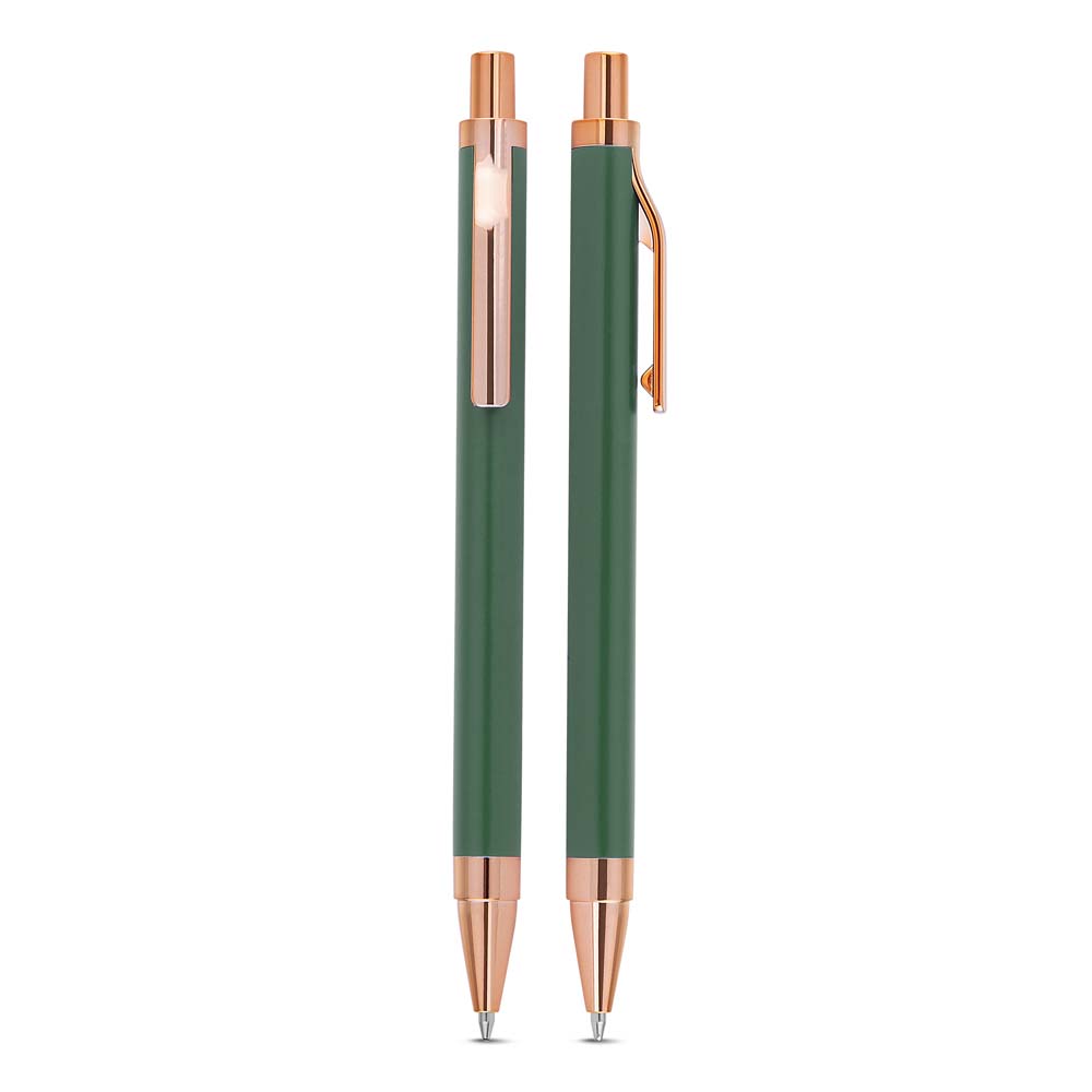 Caneta esferográfica com corpo em alumínio reciclado, acionador e clipe em acabamento rosé/bronze.