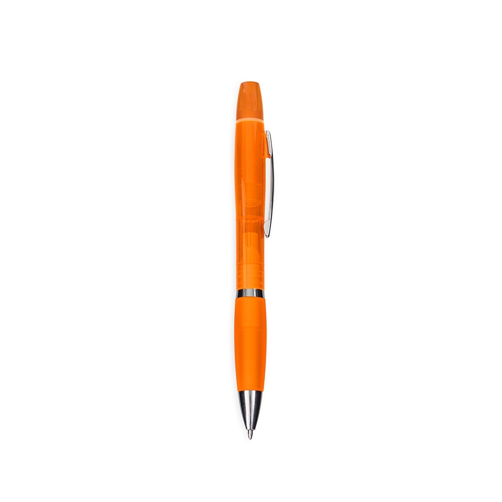 Caneta plástica com marca-texto e tampa protetora localizados no topo. Possui clip e ponteira em metal, acionamento por rotação e ponta esferográfica azul de 1.0mm.
