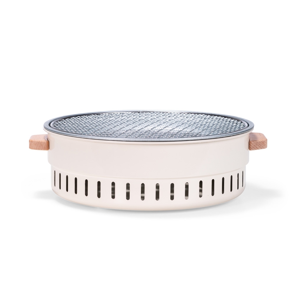 Churrasqueira portátil em ferro com alças laterais em madeira. Conta com grelha e bandejas para carvão em metal. Acompanha parafusos e chave Allen com ponta Phillips para fixação das alças.