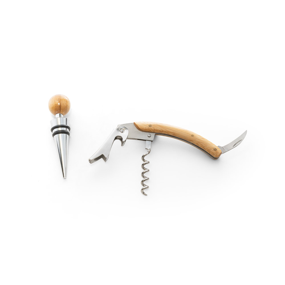 Conjunto de vinho com dois componentes em metal e bambu: um saca-rolhas e um salva-gotas. Fornecido em caixa presente de papel kraft reciclado. A cor e o resultado da impressão nos materiais naturais pode variar entre produtos. Caixa: 159 x 99 x 29 mm