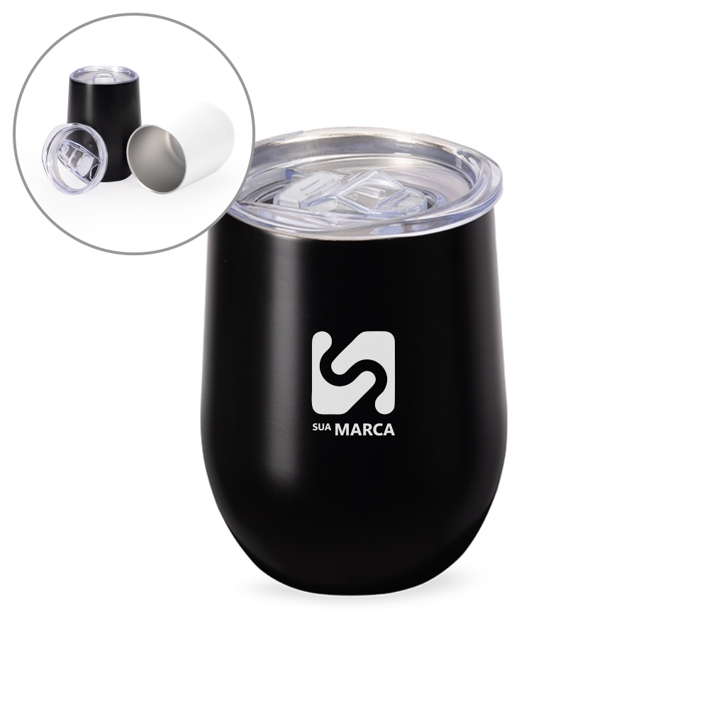 Descrição: Copo térmico feito em aço inox e com capacidade de até 300ml. Sua construção em parede dupla, tampa plástica com vedação a vácuo e bocal com trava de segurança permitem a conservação de temperatura de líquidos por mais tempo. Possui ainda uma camada emborrachada antiderrapante em sua base.