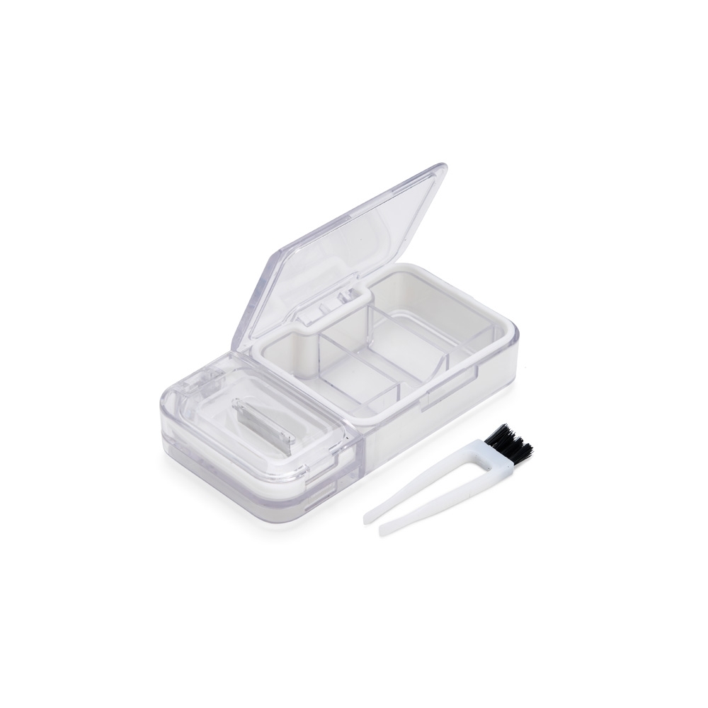 Porta-comprimidos multifuncional em plástico. Possui três divisórias com capacidade de até 10ml cada, além de dois compartimentos especiais: um cortador de comprimidos na parte superior e outro para trituração, localizado na parte inferior.