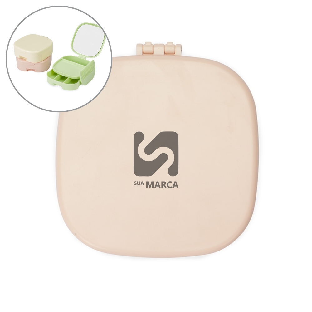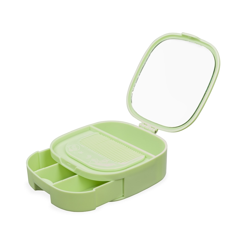 Porta-joias feito em plástico com espelho sem aumento na parte interna da tampa. Possui compartimentos internos de tamanhos variados e uma gaveta com três divisórias. Acompanha um pente compacto para cabelos.