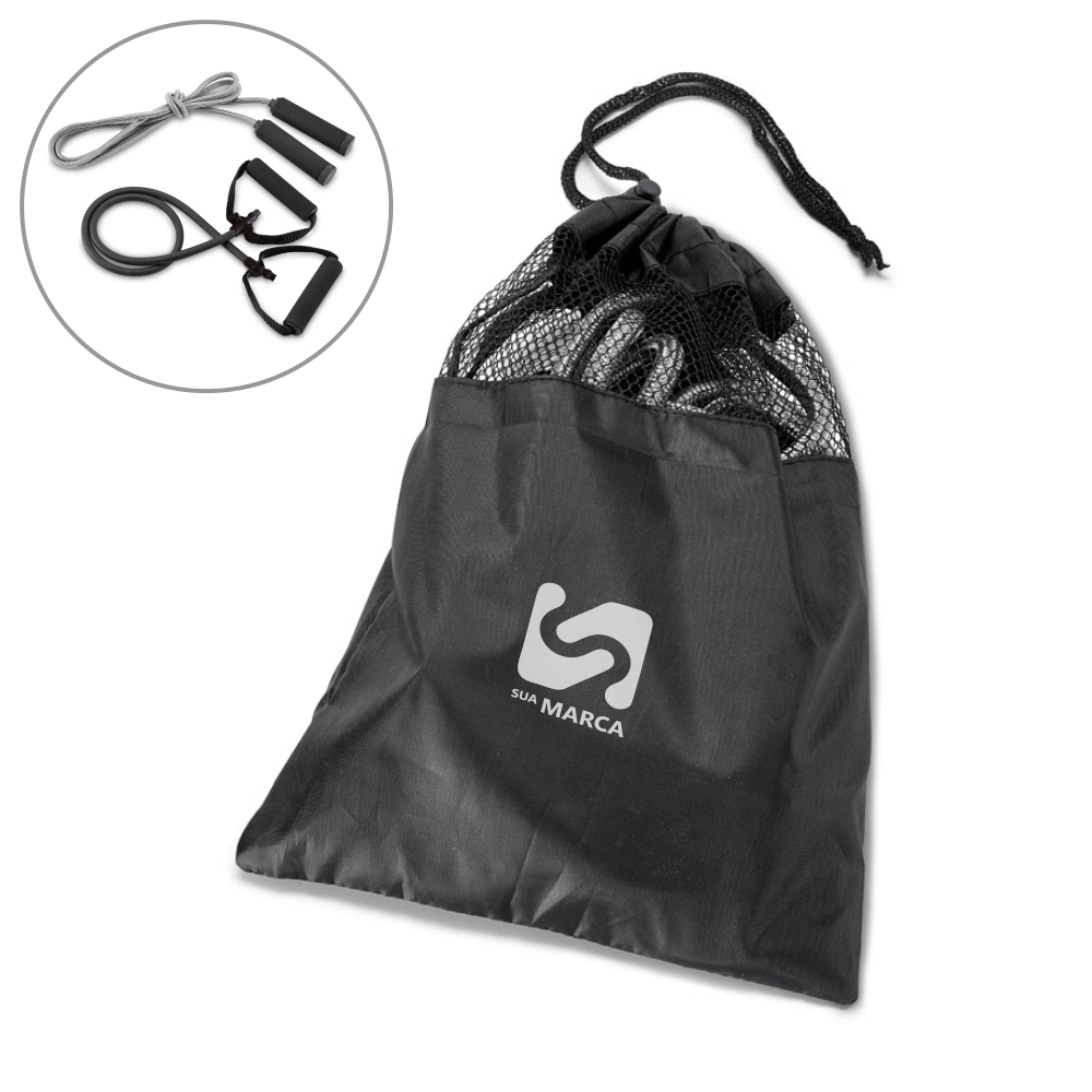 Kit fitness composto por elástico e corda de pular. Fornecido com bolsa em 190T. Bolsa: 210 x 270 mm.