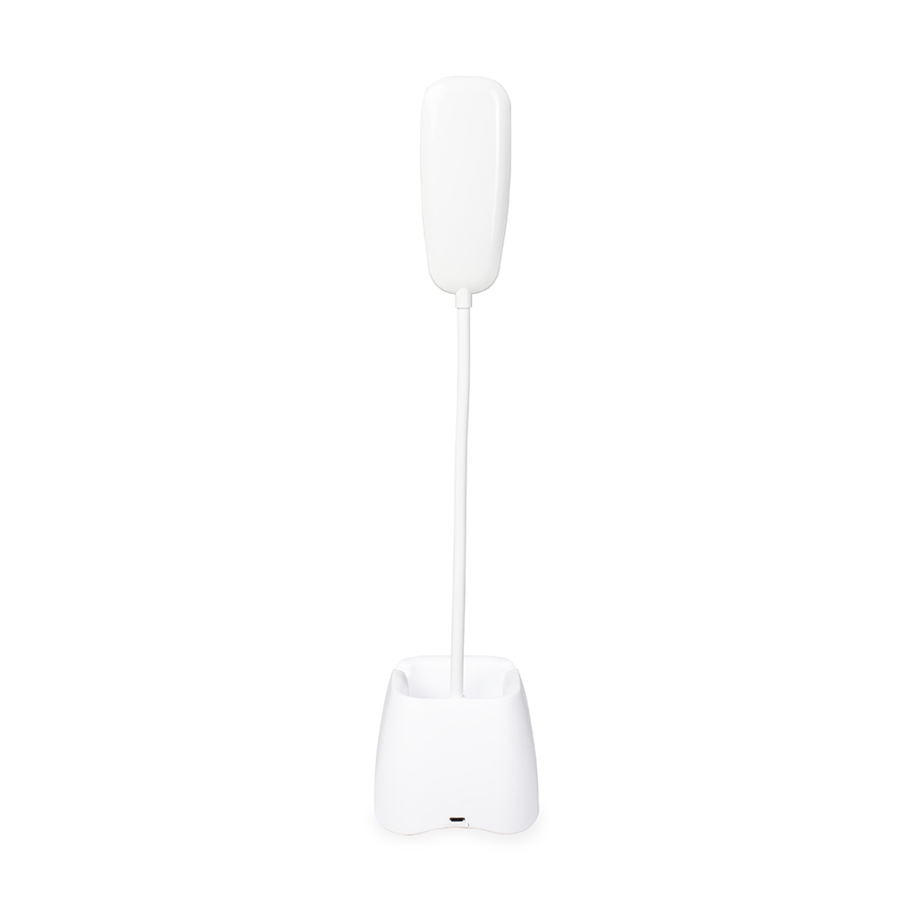 Luminária recarregável com 18 LEDs, estrutura em plástico e haste articulável em múltiplos ângulos. Possui base com porta-canetas e acionamento por toque para a seleção de três níveis diferentes de iluminação. Acompanha cabo Micro USB para recarga.