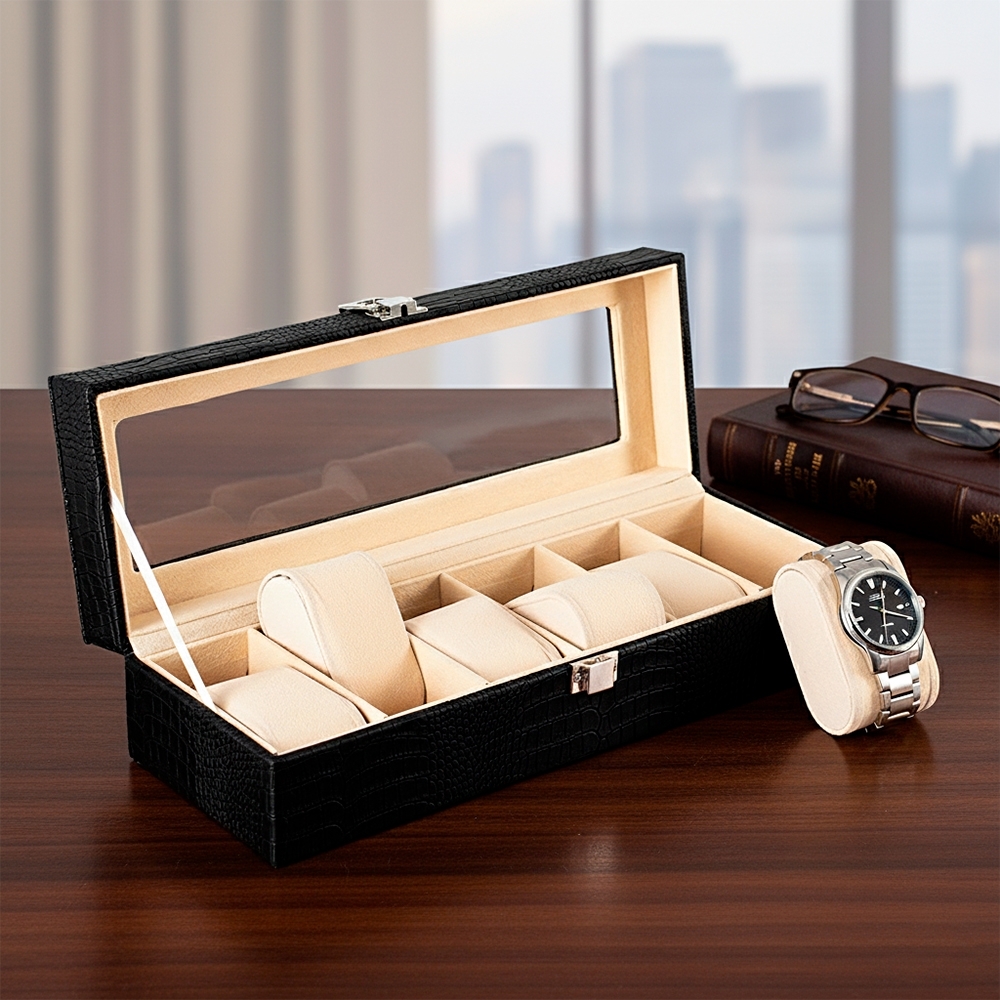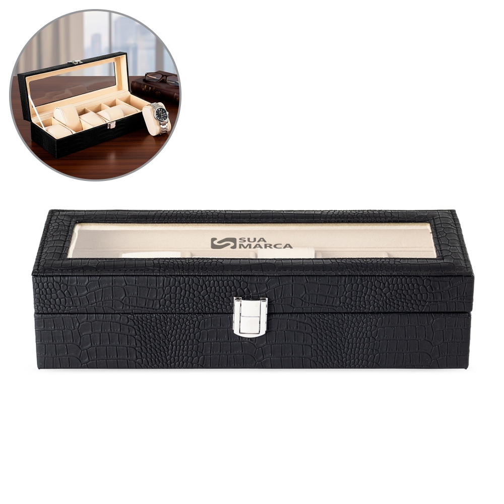 Porta-relógios com aacabamento texturizado em couro sintético à base de PVC e revestimento interno em veludo. Conta com seis divisórias com almofadas removíveis, visor em vidro e trava de segurança na tampa.