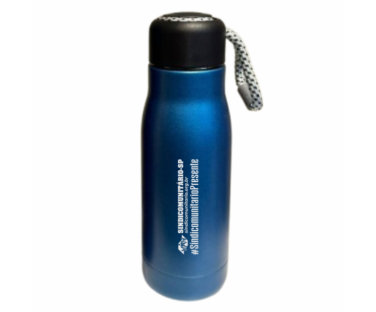 Garrafa térmica com capacidade de 420ml feita em inox 304 com parede dupla. Tampa plástica com corda para transporte embutida.