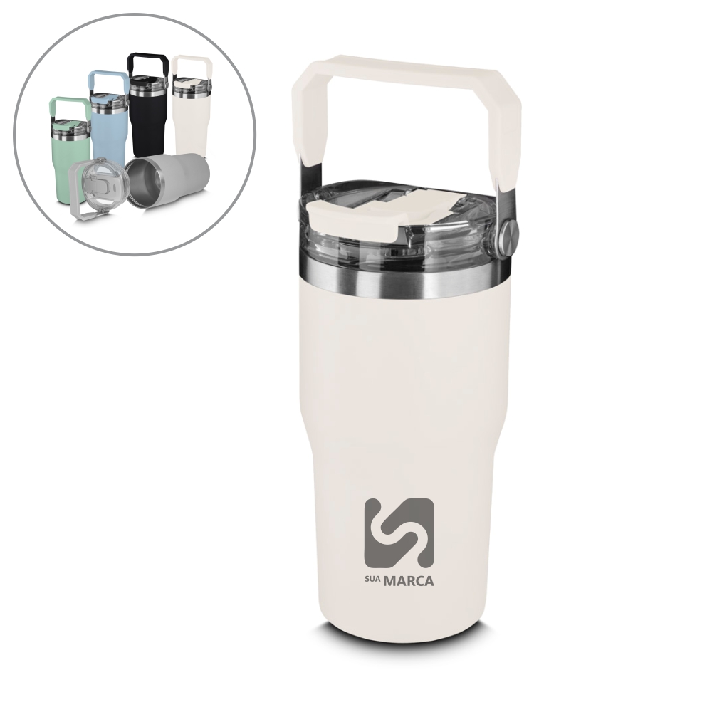 Garrafa térmica em aço inox com parede dupla com capacidade de até 650ml,tampa rosqueável com alça em plástico, permite-se hidratar por canudo ou bico, com anel de silicone para vedação.