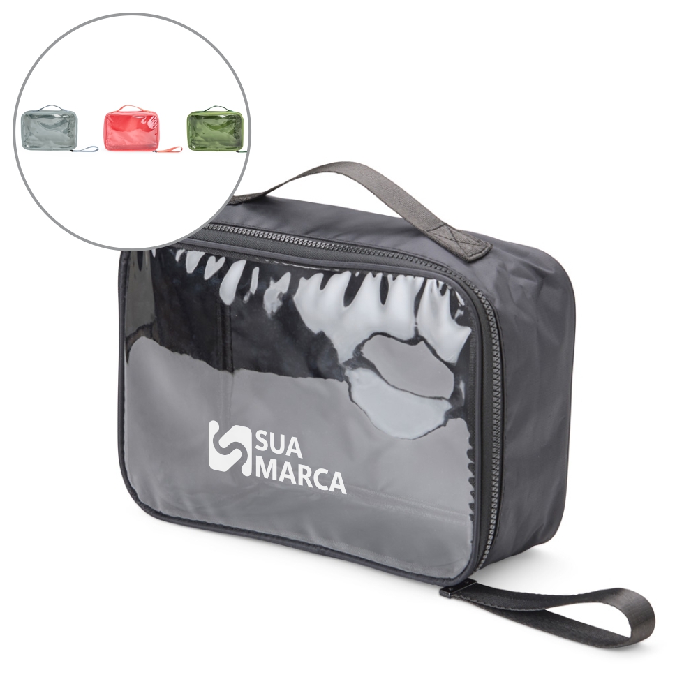 Descrição: Nécessaire confeccionada em nylon, com frente em visor transparente, fechamento por zíper e alça superior. Inclui também uma alça de transporte em nylon.