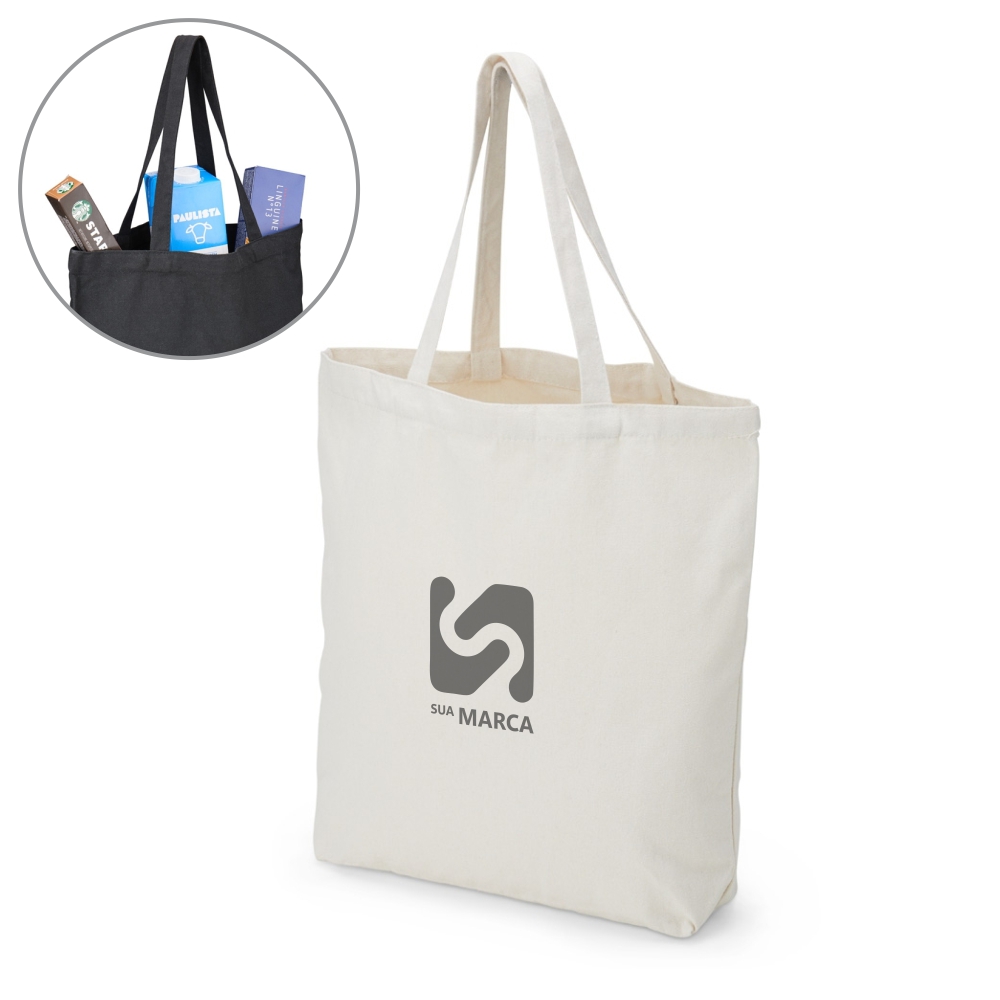 Descrição: Sacola de algodão com alças costuradas na parte interna.