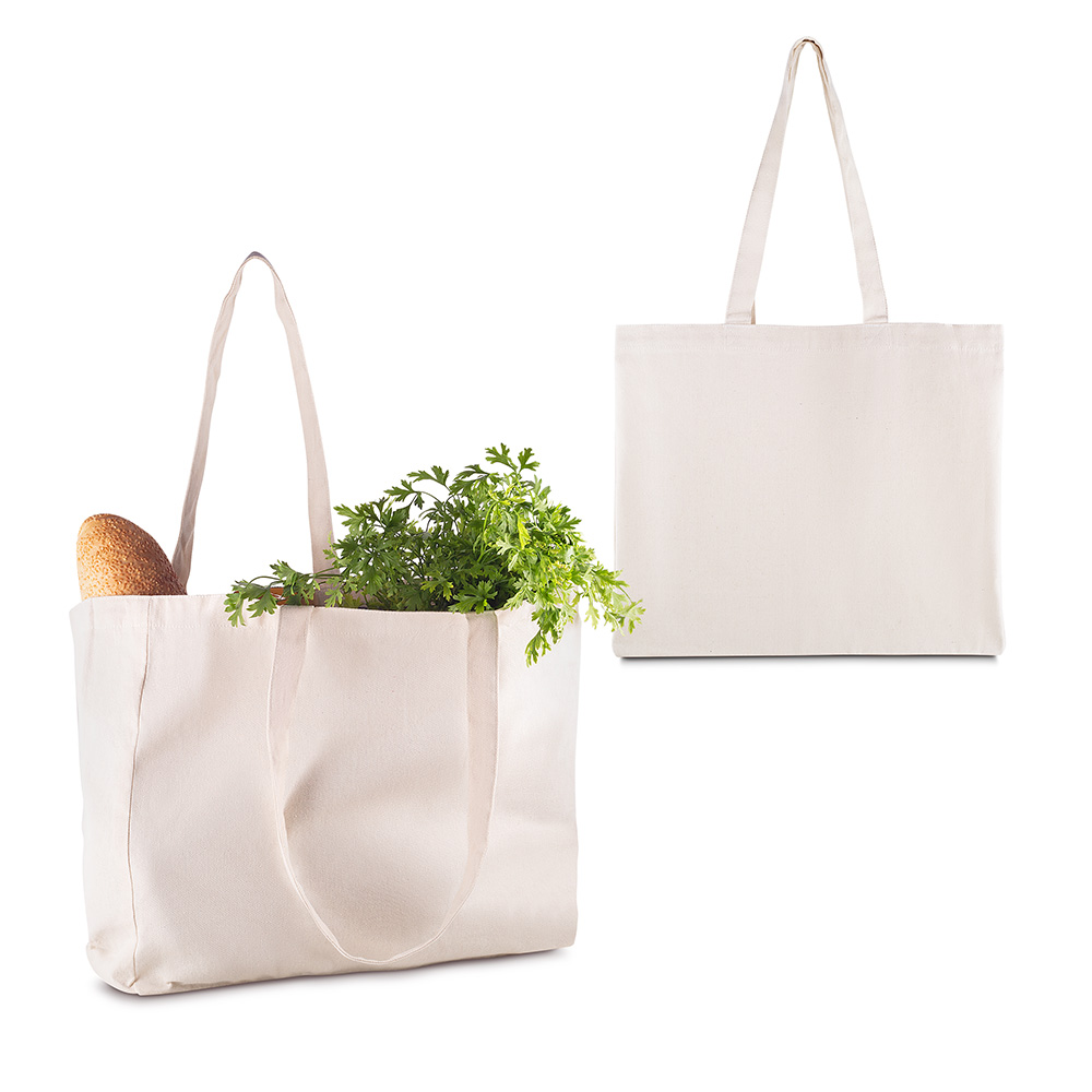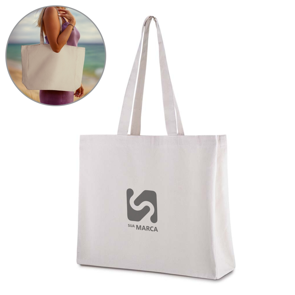 Sacola em Algodão Cru 200g/m² com base plana. Alça com altura de 31 cm, ideal para transporte.