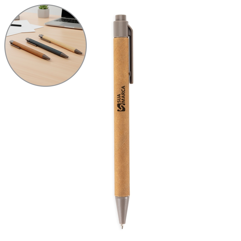 Caneta com corpo em papelão, ponteira e clip em plástico ABS, com acionamento por clique e carga esferográfica azul de 1,0mm.