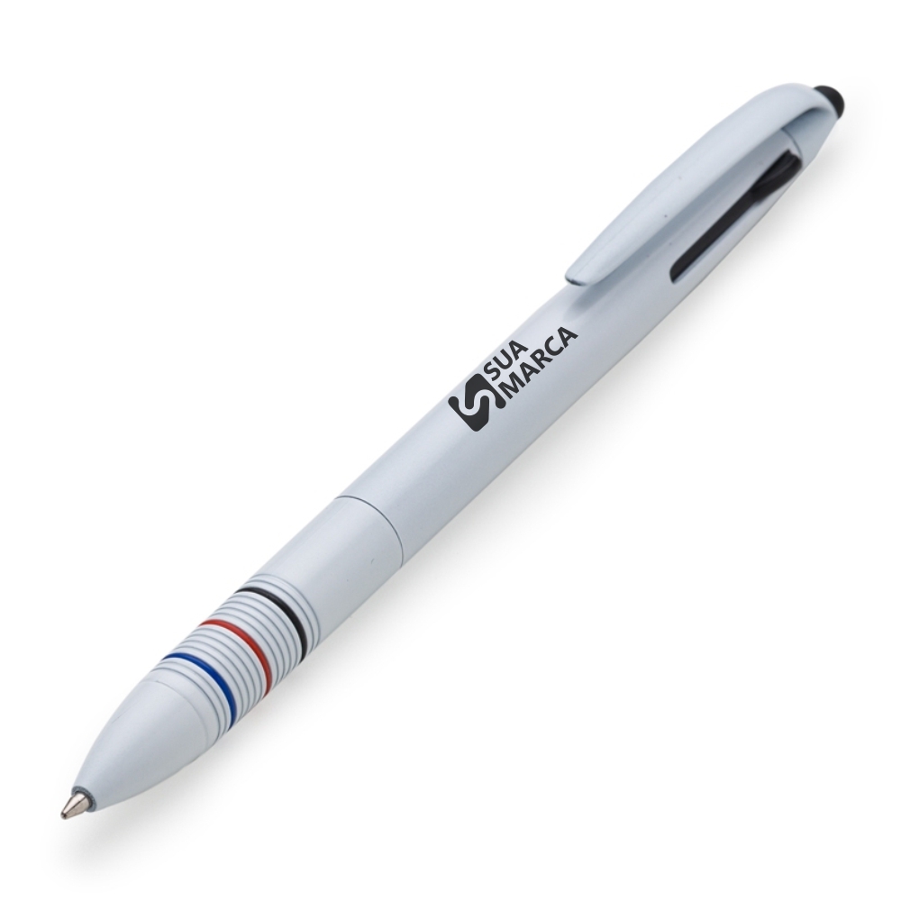 Caneta plástica três cores e ponteira touch, corpo branco com detalhes coloridos. Possui as cargas azul, preto e vermelho (basta descer o suporte colorido pra acionar a cor). Clip plástico e touch superior, possui anéis preto, vermelho e azul na parte inferior em relevo.