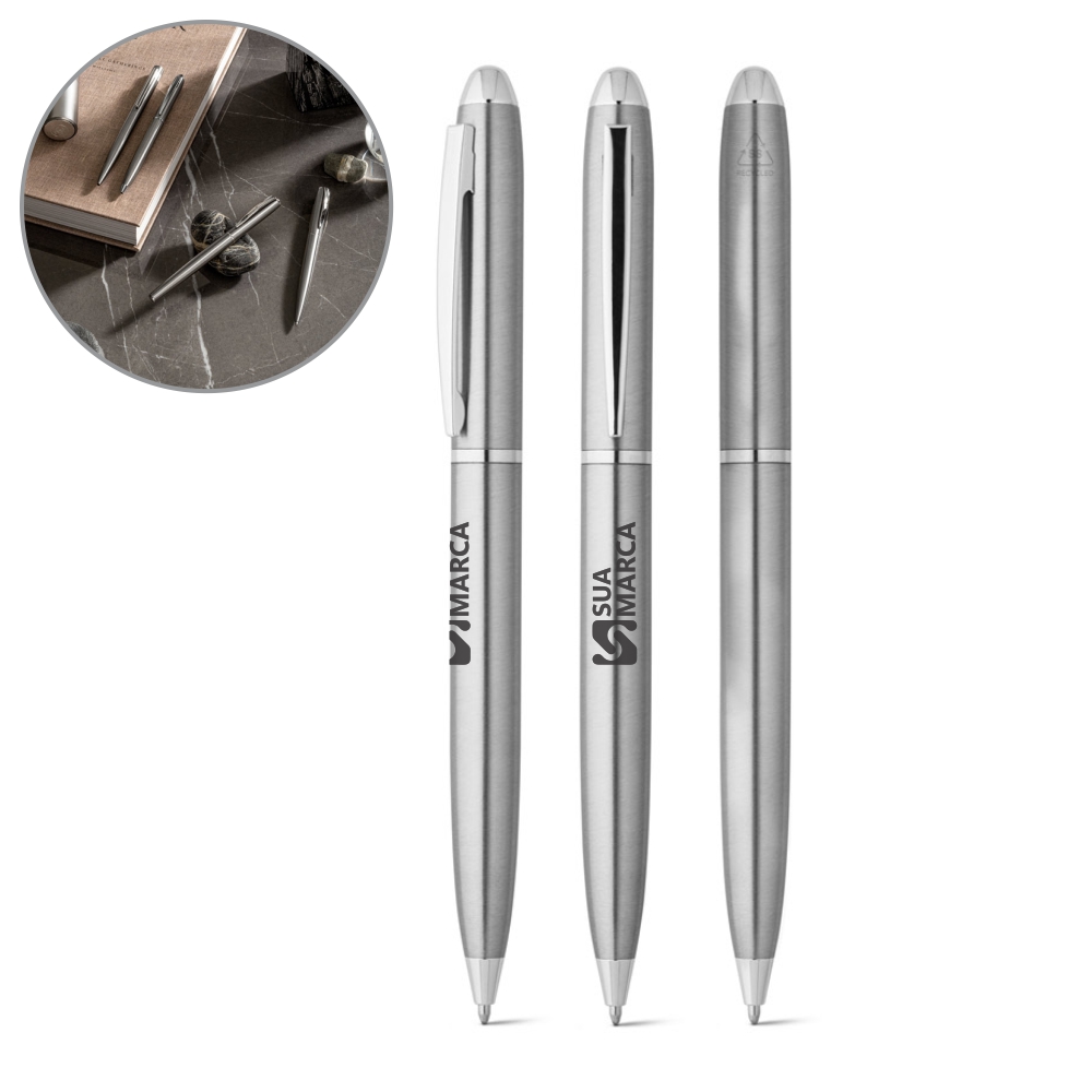 Esferográfica com corpo em aço inox 53% reciclado e clipe. A esferográfica tem escrita em preto e mecanismo twist. Fornecida numa bolsa presente em cortiça. Esferográfica: ø11 mm x 137 | Caixa: 155 x 40 mm