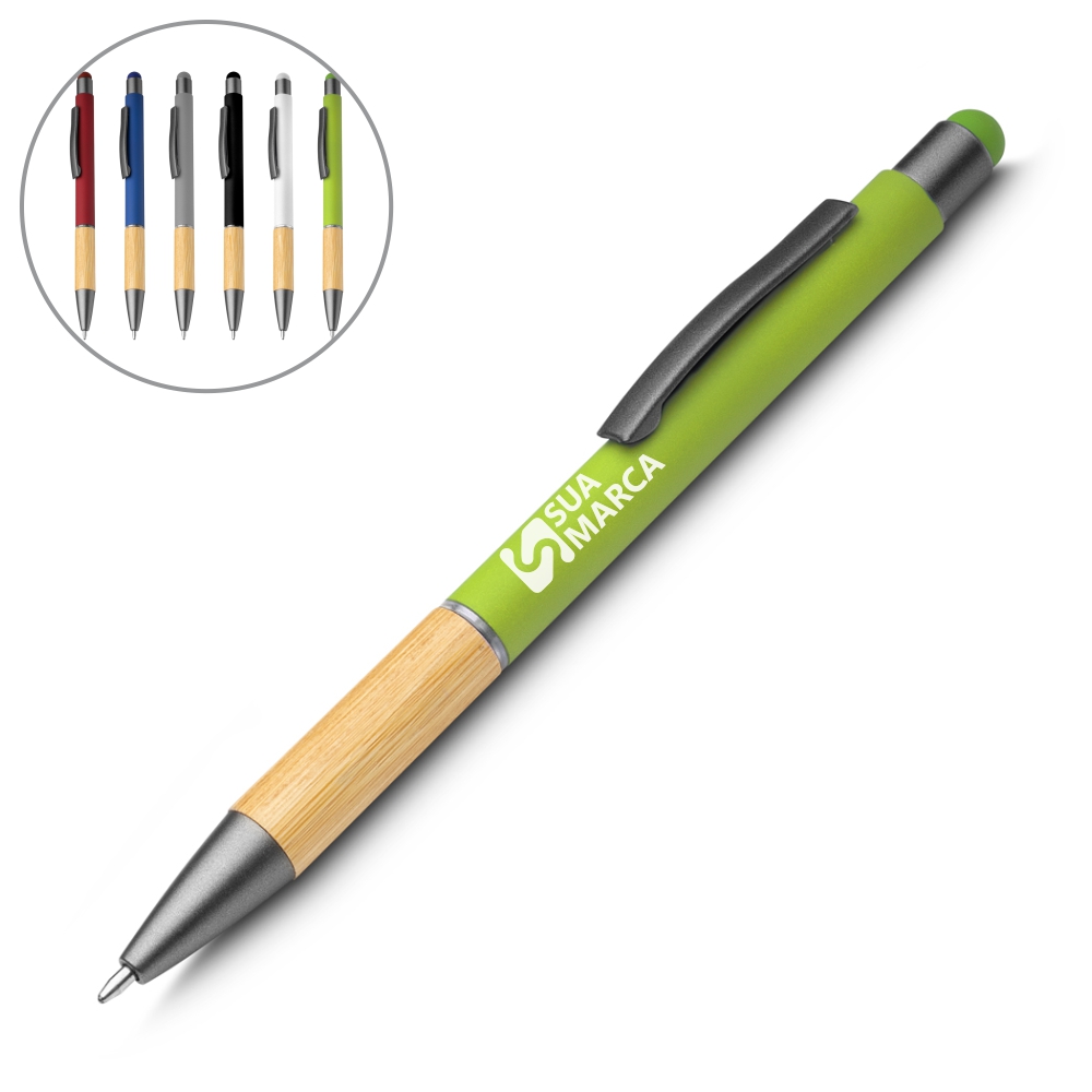 Caneta esferográfica em alumínio reciclável com escrita em azul. Detalhe em bambu. Refil parker e ponta touch emborrachada.Dimensão Produto:14,5xø1,0cm