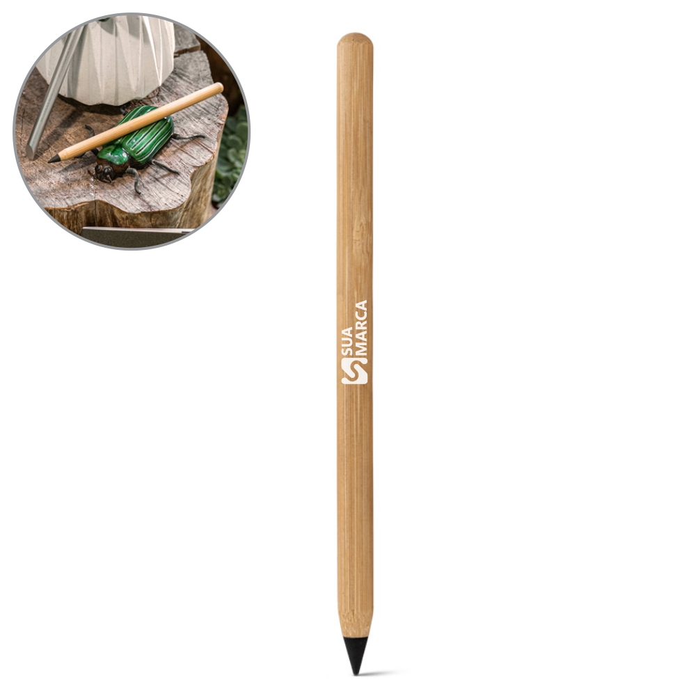 Caneta sem tinta com ponta de liga metálica com grafite e corpo em bambu. Apto para um uso prolongado. Até 2 km de escrita. Não é necessário apontar e a escrita pode ser apagada. Produto amigo do ambiente. Ø8 x 138 mm