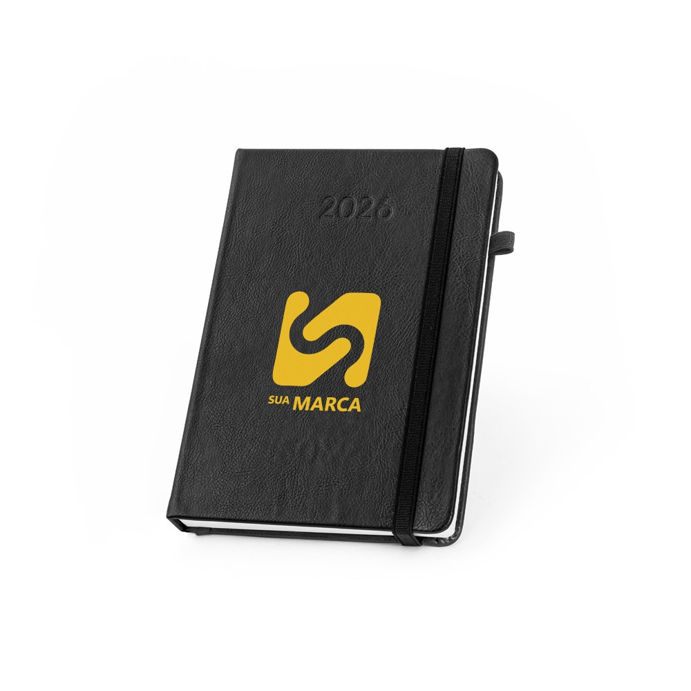 Agenda B5 em PU à base de água. Inclui um suporte para esferográfica (não inclusa), marcador em fita e um elástico para fechamento da agenda.